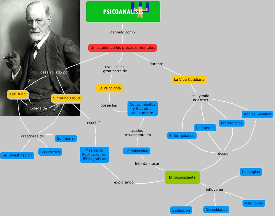 Este Cmap, tiene información relacionada con: Psicoanalisis, Sigmund Freud creadores de Su Teoria, Un estudio de los procesos mentales durante La Vida Cotidiana, Un estudio de los procesos mentales desarrollado por Sigmund Freud, Karl Jung creadores de Su Investigacion, La Vida Cotidiana incluyendo nuestras Reglas Sociales, Enfermedades desde El Inconsciente, El Inconsciente influye en Seducción, Sigmund Freud creadores de Su Investigacion, Conocimientos y Secretos de la mente usados actualmente en La Publicidad, El Inconsciente influye en Ideologías, La Vida Cotidiana incluyendo nuestras Decisiones, La Vida Cotidiana incluyendo nuestras Preferencias, Más de 18 Publicaciones Bibliograficas explorando El Inconsciente, Decisiones desde El Inconsciente, El Inconsciente influye en Necesidades, Sigmund Freud escribió Más de 18 Publicaciones Bibliograficas, Reglas Sociales desde El Inconsciente, Un estudio de los procesos mentales desarrollado por Karl Jung, Karl Jung Colega de Sigmund Freud, La Psicología posee los Conocimientos y Secretos de la mente