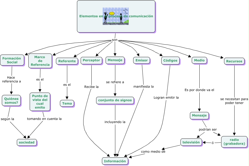 Este Cmap, tiene información relacionada con: comunicación, Elementos en el proceso de comunicación son Recursos, Mensaje podrían ser radio (grabadora), Elementos en el proceso de comunicación son Marco de Referencia, Formación Social Hace referencia a Quiénes somos?, Elementos en el proceso de comunicación son Medio, conjunto de signos incluyendo la Información, Marco de Referencia es el Punto de vista del cual emito, Mensaje se refiere a conjunto de signos, Elementos en el proceso de comunicación son Códigos, Elementos en el proceso de comunicación son Perceptor, Emisor manifiesta la Información, Recursos se necesitan para poder tener radio (grabadora), Mensaje podrían ser televisión, Punto de vista del cual emito tomando en cuenta la sociedad, Referente es el Tema, Elementos en el proceso de comunicación son Formación Social, Códigos Logran emitir la Información, Quiénes somos? según la sociedad, Perceptor Recibe la Información, Elementos en el proceso de comunicación son Mensaje