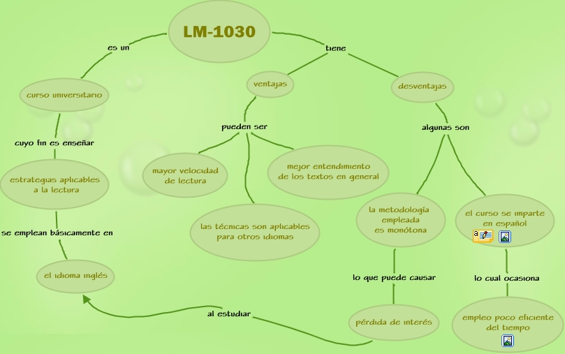 Este Cmap, tiene información relacionada con: LM-1030 caro, LM-1030 es un curso universitario, LM-1030 tiene ventajas, estrategias aplicables a la lectura se emplean básicamente en el idioma inglés, pérdida de interés al estudiar el idioma inglés, la metodología empleada es monótona lo que puede causar pérdida de interés, desventajas algunas son la metodología empleada es monótona, LM-1030 tiene desventajas, desventajas algunas son el curso se imparte en español, curso universitario cuyo fin es enseñar estrategias aplicables a la lectura, ventajas pueden ser mejor entendimiento de los textos en general, ventajas pueden ser mayor velocidad de lectura, ventajas pueden ser las técnicas son aplicables para otros idiomas, el curso se imparte en español lo cual ocasiona empleo poco eficiente del tiempo