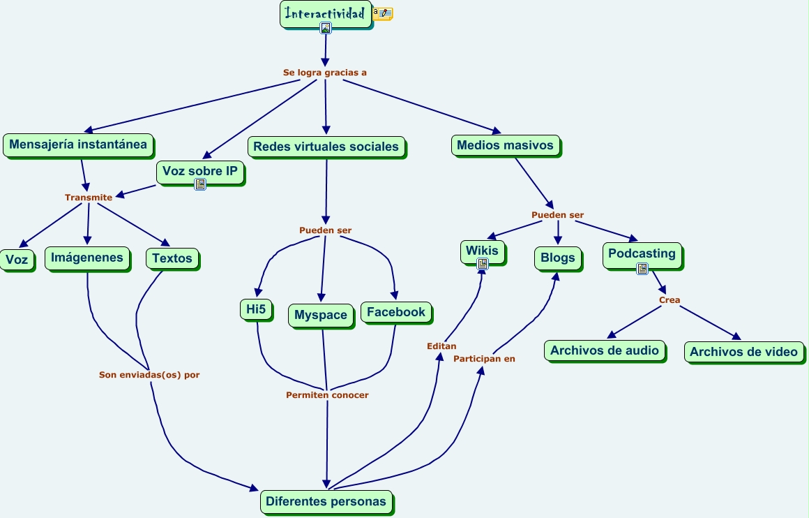 Este Cmap, tiene información relacionada con: Académico - Grettel, Textos Son enviadas(os) por Diferentes personas, Hi5 Permiten conocer Diferentes personas, Diferentes personas Editan Wikis, Facebook Permiten conocer Diferentes personas, Medios masivos Pueden ser Podcasting, Mensajería instantánea Transmite Textos, Mensajería instantánea Transmite Voz, Imágenenes Son enviadas(os) por Diferentes personas, Redes virtuales sociales Pueden ser Hi5, Mensajería instantánea Transmite Imágenenes, Interactividad Se logra gracias a Redes virtuales sociales, Voz sobre IP Transmite Imágenenes, Interactividad Se logra gracias a Medios masivos, Redes virtuales sociales Pueden ser Myspace, Diferentes personas Participan en Blogs, Podcasting Crea Archivos de audio, Medios masivos Pueden ser Wikis, Interactividad Se logra gracias a Mensajería instantánea, Myspace Permiten conocer Diferentes personas, Voz sobre IP Transmite Textos