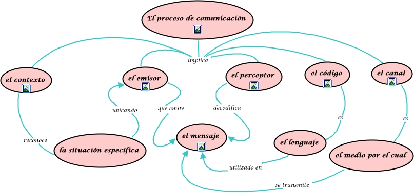 Este Cmap, tiene información relacionada con: el proceso de comunicación, El proceso de comunicación implica el código, El proceso de comunicación implica el canal, El proceso de comunicación implica el contexto, el lenguaje utilizado en el mensaje, El proceso de comunicación implica el emisor, el código es el lenguaje, El proceso de comunicación implica el perceptor, el contexto reconoce la situación específica, la situación específica ubicando el emisor, el canal es el medio por el cual, el emisor que emite el mensaje, el medio por el cual se transmite el mensaje, el perceptor decodifica el mensaje