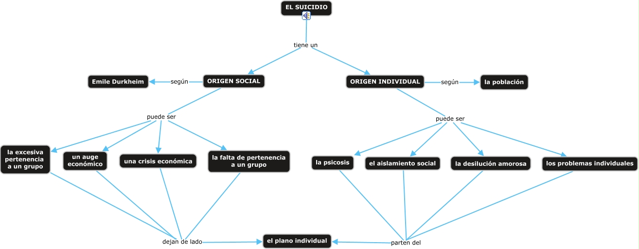 This Concept Map, created with IHMC CmapTools, has information related to: el suicidio, ORIGEN SOCIAL puede ser la falta de pertenencia a un grupo, la excesiva pertenencia a un grupo dejan de lado el plano individual, ORIGEN INDIVIDUAL puede ser el aislamiento social, ORIGEN SOCIAL según Emile Durkheim, ORIGEN INDIVIDUAL puede ser la desilución amorosa, ORIGEN SOCIAL puede ser la excesiva pertenencia a un grupo, la falta de pertenencia a un grupo dejan de lado el plano individual, una crisis económica dejan de lado el plano individual, ORIGEN INDIVIDUAL según la población, un auge económico dejan de lado el plano individual, EL SUICIDIO tiene un ORIGEN SOCIAL, la desilución amorosa parten del el plano individual, ORIGEN SOCIAL puede ser un auge económico, la psicosis parten del el plano individual, ORIGEN SOCIAL puede ser una crisis económica, los problemas individuales parten del el plano individual, ORIGEN INDIVIDUAL puede ser la psicosis, el aislamiento social parten del el plano individual, EL SUICIDIO tiene un ORIGEN INDIVIDUAL, ORIGEN INDIVIDUAL puede ser los problemas individuales