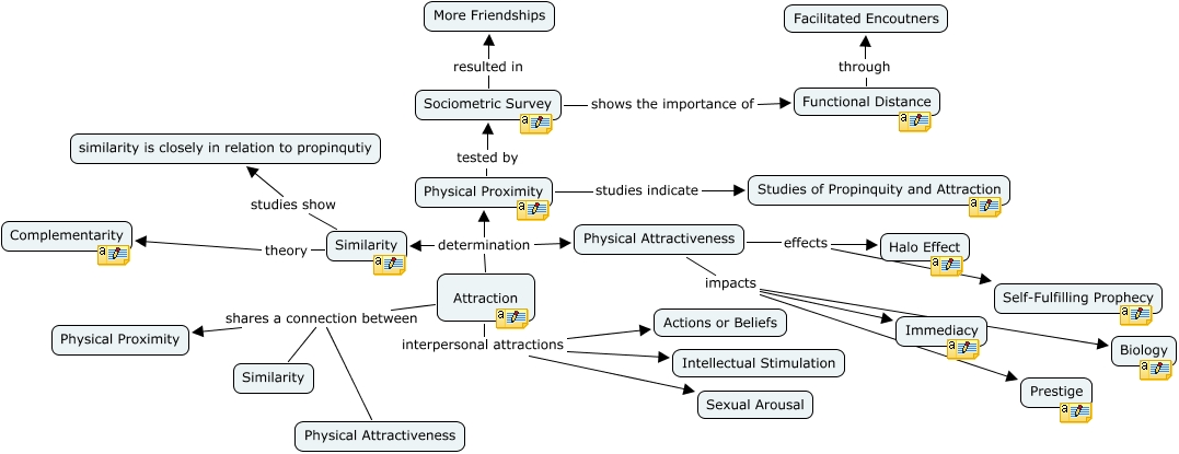 This Concept Map, created with IHMC CmapTools, has information related to: CMap4, Physical Attractiveness effects Halo Effect, Attraction interpersonal attractions Intellectual Stimulation, Similarity studies show similarity is closely in relation to propinqutiy, Attraction shares a connection between Similarity, Physical Attractiveness effects Self-Fulfilling Prophecy, Sociometric Survey resulted in More Friendships, Attraction interpersonal attractions Sexual Arousal, Physical Attractiveness impacts Biology, Physical Proximity studies indicate Studies of Propinquity and Attraction, Sociometric Survey shows the importance of Functional Distance, Physical Attractiveness impacts Prestige, Attraction interpersonal attractions Actions or Beliefs, Attraction determination Similarity, Attraction determination Physical Proximity, Similarity theory Complementarity, Attraction shares a connection between Physical Attractiveness, Attraction shares a connection between Physical Proximity, Physical Proximity tested by Sociometric Survey, Physical Attractiveness impacts Immediacy, Attraction determination Physical Attractiveness
