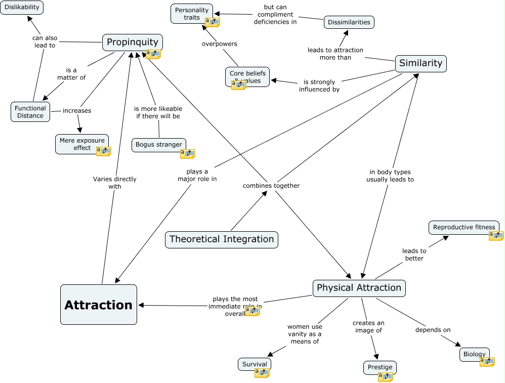 This Concept Map, created with IHMC CmapTools, has information related to: Attraction, Physical Attraction depends on Biology, Propinquity is a matter of Functional Distance, Physical Attraction creates an image of Prestige, Attraction Varies directly with Propinquity, Similarity in body types usually leads to Physical Attraction, Propinquity increases Mere exposure effect, Functional Distance increases Mere exposure effect, Bogus stranger is more likeable if there will be Propinquity, Theoretical Integration combines together Propinquity, Propinquity can also lead to Dislikability, Similarity leads to attraction more than Dissimilarities, Physical Attraction plays the most immediate role in overall Attraction, Theoretical Integration combines together Physical Attraction, Theoretical Integration combines together Similarity, Physical Attraction women use vanity as a means of Survival, Physical Attraction leads to better Reproductive fitness, Core beliefs & values overpowers Personality traits, Similarity plays a major role in Attraction, Functional Distance can also lead to Dislikability, Dissimilarities but can compliment deficiencies in Personality traits