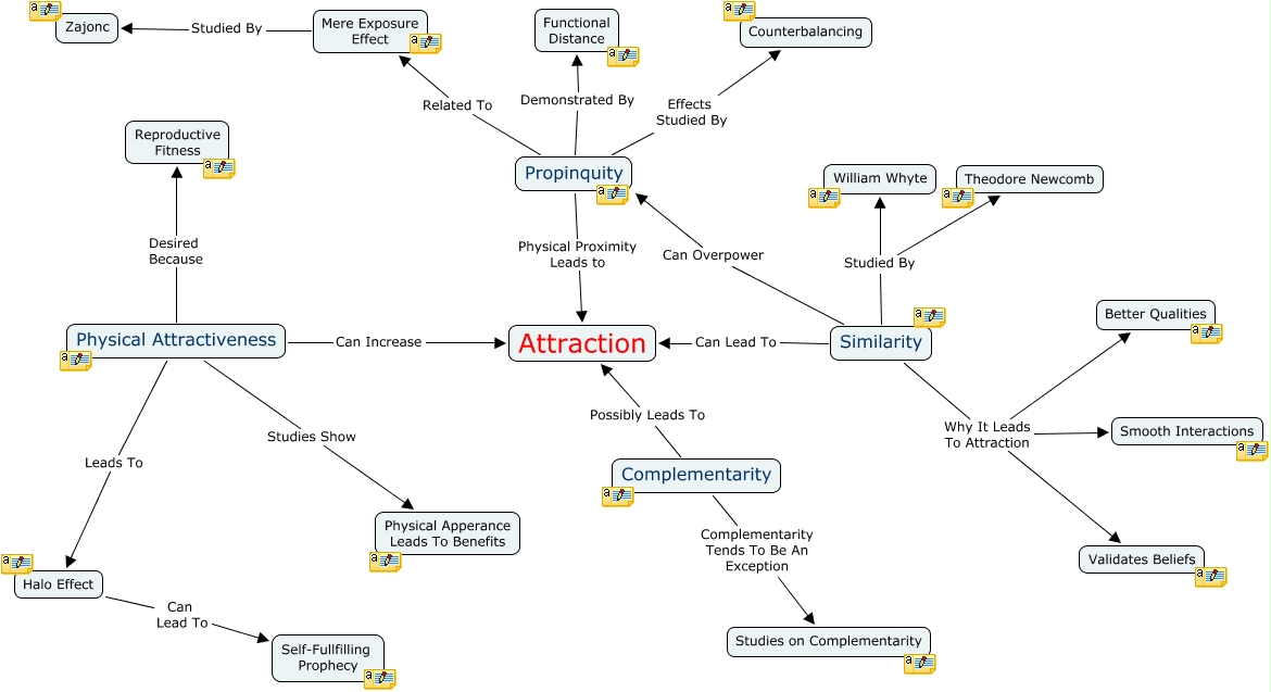 This Concept Map, created with IHMC CmapTools, has information related to: Attraction Cmap, Propinquity Physical Proximity Leads to Attraction, Complementarity Possibly Leads To Attraction, Similarity Why It Leads To Attraction Smooth Interactions, Similarity Can Overpower Propinquity, Similarity Studied By Theodore Newcomb, Mere Exposure Effect Studied By Zajonc, Propinquity Demonstrated By Functional Distance, Complementarity Complementarity Tends To Be An Exception Studies on Complementarity, Physical Attractiveness Desired Because Reproductive Fitness, Physical Attractiveness Can Increase Attraction, Physical Attractiveness Leads To Halo Effect, Similarity Can Lead To Attraction, Halo Effect Can Lead To Self-Fullfilling Prophecy, Propinquity Related To Mere Exposure Effect, Physical Attractiveness Studies Show Physical Apperance Leads To Benefits, Similarity Studied By William Whyte, Similarity Why It Leads To Attraction Validates Beliefs, Propinquity Effects Studied By Counterbalancing, Similarity Why It Leads To Attraction Better Qualities
