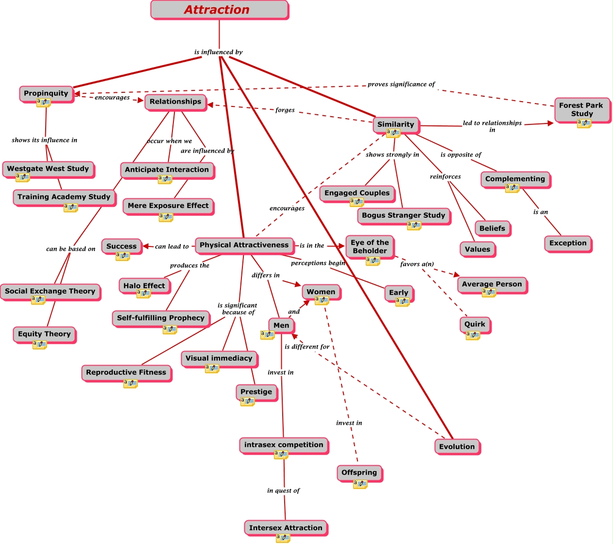 This Concept Map, created with IHMC CmapTools, has information related to: Attraction, Physical Attractiveness perceptions begin Early, Physical Attractiveness can lead to Success, Similarity shows strongly in Bogus Stranger Study, Evolution is different for Men, Physical Attractiveness produces the Halo Effect, Eye of the Beholder favors a(n) Average Person, Similarity shows strongly in Engaged Couples, Physical Attractiveness is significant because of Prestige, Propinquity shows its influence in Westgate West Study, Relationships are influenced by Mere Exposure Effect, Similarity is opposite of Complementing, Eye of the Beholder favors a(n) Quirk, Relationships can be based on Social Exchange Theory, Physical Attractiveness is in the Eye of the Beholder, Attraction is influenced by Physical Attractiveness, Physical Attractiveness is significant because of Reproductive Fitness, Propinquity shows its influence in Training Academy Study, Attraction is influenced by Evolution, Forest Park Study proves significance of Propinquity, Similarity reinforces Beliefs
