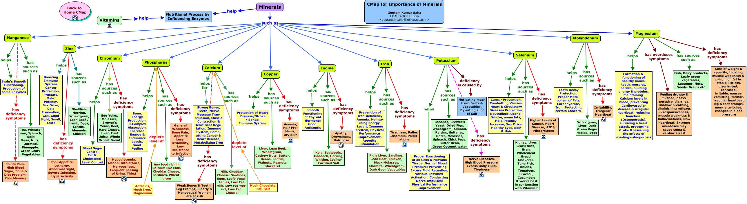 This Concept Map has information related to: CMap for Importance of Minerals, Manganese has deficiency symptoms Joints Pain, High Blood Sugar, Bone & Disc Problem, Poor Memory, Manganese has sources such as Tea, Wheatg- ram, Spinach, Split Peas, Nuts, Oatmeal, Pineapple, Green Leafy Vegetables, Selenium has deficiency symptoms Higher Levels of Cancer, Heart Disease, AIDS, Miscarriages, Minerals such as Potassium, Magnesium has deficiency symptoms Loss of weight & appetite; bloating, muscle weakness & pain, high fat in stools, listless, disoriented, confused, irritable, nausea, vomitting, tremor, irregular heartbeat, leg & foot cramps, muscle twitches, changes in blood pressure, Magnesium has sources such as Fish, Dairy products, Leafy green vegetables, Legumes, Nuts, Seeds, Grains etc, Minerals such as Iodine, Potassium helps Proper Functioning of all Cells & Nervous Tissue; Normal Blood Pressure; Preventing Excess Fluid Retention; Various Enzymes Activation; Conducting Nerve Impulses; Physical Performance Improvement, Chromium helps Blood Sugar Control, Fat & Cholesterol Level Control, Selenium has sources such as Kidney, Liver, Brazil Nuts, Bran, Wholemeal Bread, Mackerel, Tuna Fish, Onions, Tomatoes, Broccoli, Cucumber; It works best in conjunction with Vitamin E