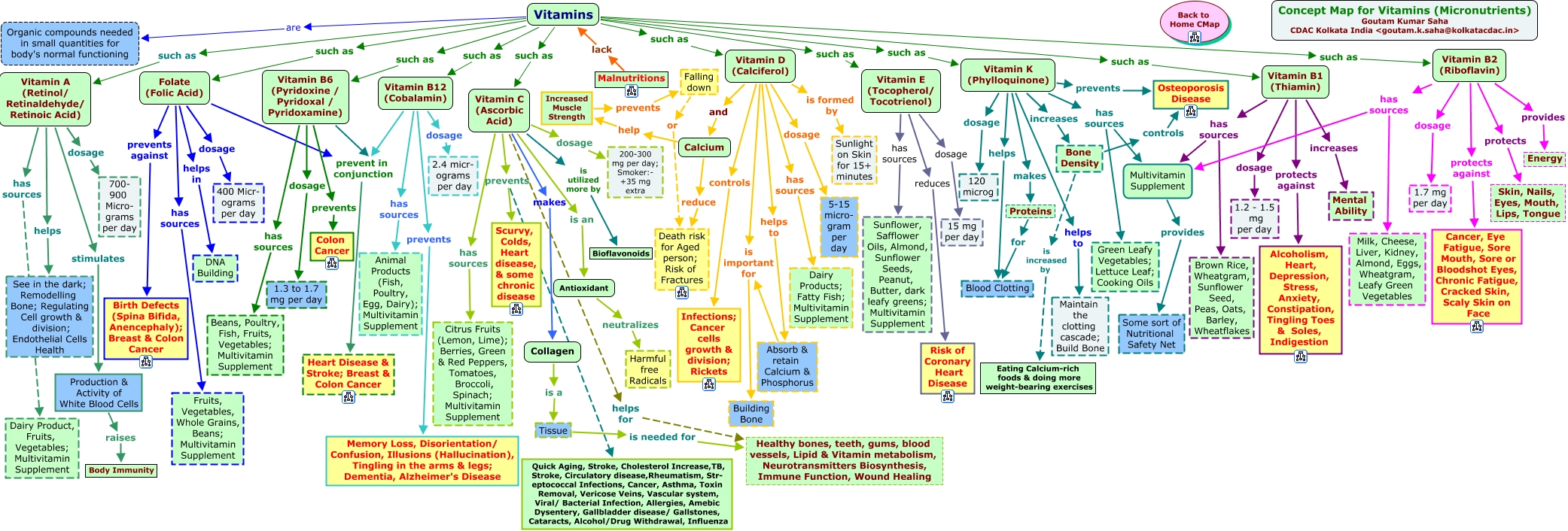 This Concept Map has information related to: cmap for Vitamins, Vitamin D (Calciferol) helps to Absorb & retain Calcium & Phosphorus, Vitamin K (Phylloquinone) has sources Green Leafy Vegetables; Lettuce Leaf; Cooking Oils, Folate (Folic Acid) has sources Fruits, Vegetables, Whole Grains, Beans; Multivitamin Supplement, Folate (Folic Acid) prevents against Birth Defects (Spina Bifida, Anencephaly); Breast & Colon Cancer, Vitamins such as Vitamin B6 (Pyridoxine / Pyridoxal / Pyridoxamine), Production & Activity of White Blood Cells raises Body Immunity, Vitamin A (Retinol/ Retinaldehyde/ Retinoic Acid) stimulates Production & Activity of White Blood Cells, Vitamin D (Calciferol) is formed by Sunlight on Skin for 15+ minutes, Vitamin C (Ascorbic Acid) helps for Healthy bones, teeth, gums, blood vessels, Lipid & Vitamin metabolism, Neurotransmitters Biosynthesis, Immune Function, Wound Healing, Vitamins such as Vitamin C (Ascorbic Acid)