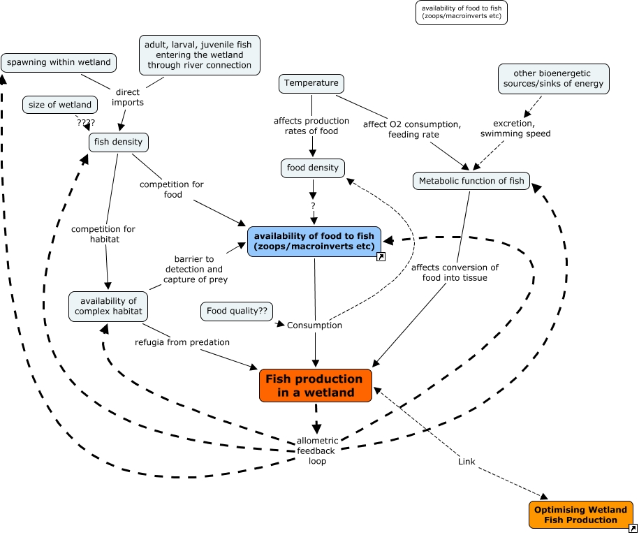 This Concept Map has information related to: fish growth in a wetland, food density ? availability of food to fish (zoops/macroinverts etc), Fish production in a wetland allometric feedback loop spawning within wetland, spawning within wetland direct imports fish density, fish density competition for habitat availability of complex habitat, Metabolic function of fish affects conversion of food into tissue Fish production in a wetland, Food quality?? Consumption food density, adult, larval, juvenile fish entering the wetland through river connection direct imports fish density, Fish production in a wetland allometric feedback loop fish density, other bioenergetic sources/sinks of energy excretion, swimming speed Metabolic function of fish, Temperature affects production rates of food food density