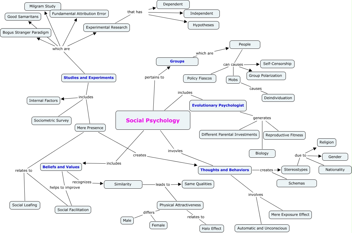 This Concept Map, created with IHMC CmapTools, has information related to: Final, Thoughts and Behaviors creates Stereostypes, Beliefs and Values recognizes Similarity, Studies and Experiments which are Fundamental Attribution Error, Studies and Experiments which are Experimental Research, Studies and Experiments includes Internal Factors, Experimental Research that has Independent, Experimental Research that has Hypotheses, Thoughts and Behaviors involves Mere Exposure Effect, Physical Attractiveness differs Male, People can causes Group Polarization, Social Psychology pertains to Groups, Evolutionary Psychologist generates Different Parental Investments, Experimental Research that has Dependent, Social Psychology includes Beliefs and Values, Studies and Experiments includes Sociometric Survey, Evolutionary Psychologist generates Reproductive Fitness, People can causes Self-Censorship, Studies and Experiments which are Milgram Study, Studies and Experiments includes Mere Presence, Mere Presence relates to Social Facilitation
