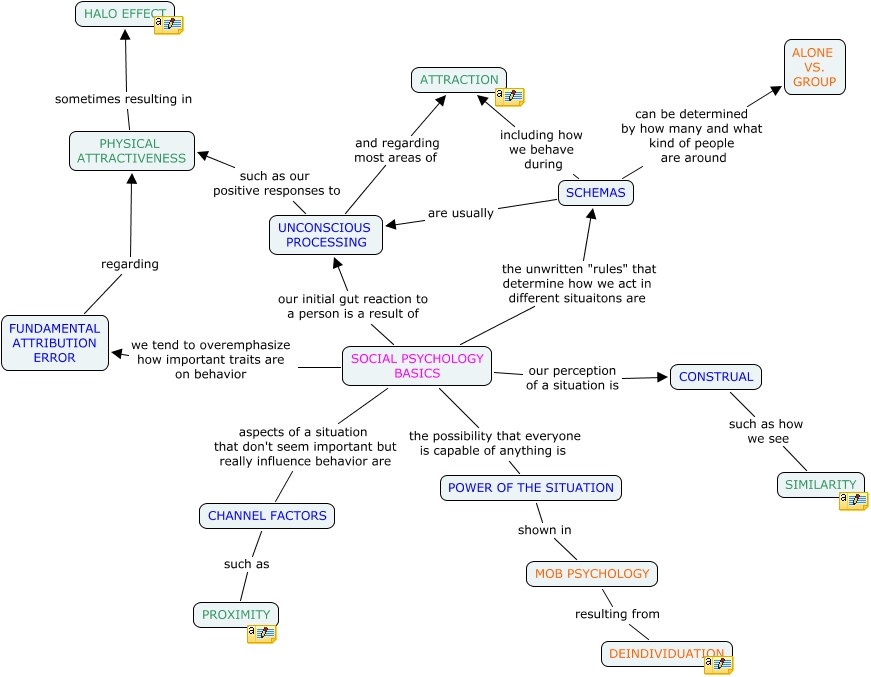 This Concept Map, created with IHMC CmapTools, has information related to: Final, SCHEMAS can be determined by how many and what kind of people are around ALONE VS. GROUP, SOCIAL PSYCHOLOGY BASICS our perception of a situation is CONSTRUAL, SCHEMAS including how we behave during ATTRACTION, SOCIAL PSYCHOLOGY BASICS we tend to overemphasize how important traits are on behavior FUNDAMENTAL ATTRIBUTION ERROR, SCHEMAS are usually UNCONSCIOUS PROCESSING, UNCONSCIOUS PROCESSING such as our positive responses to PHYSICAL ATTRACTIVENESS, SOCIAL PSYCHOLOGY BASICS our initial gut reaction to a person is a result of UNCONSCIOUS PROCESSING, SOCIAL PSYCHOLOGY BASICS the unwritten "rules" that determine how we act in different situaitons are SCHEMAS, PHYSICAL ATTRACTIVENESS sometimes resulting in HALO EFFECT, UNCONSCIOUS PROCESSING and regarding most areas of ATTRACTION, SOCIAL PSYCHOLOGY BASICS the possibility that everyone is capable of anything is POWER OF THE SITUATION, CHANNEL FACTORS such as PROXIMITY, SOCIAL PSYCHOLOGY BASICS aspects of a situation that don't seem important but really influence behavior are CHANNEL FACTORS, POWER OF THE SITUATION shown in MOB PSYCHOLOGY, MOB PSYCHOLOGY resulting from DEINDIVIDUATION, FUNDAMENTAL ATTRIBUTION ERROR regarding PHYSICAL ATTRACTIVENESS, CONSTRUAL such as how we see SIMILARITY