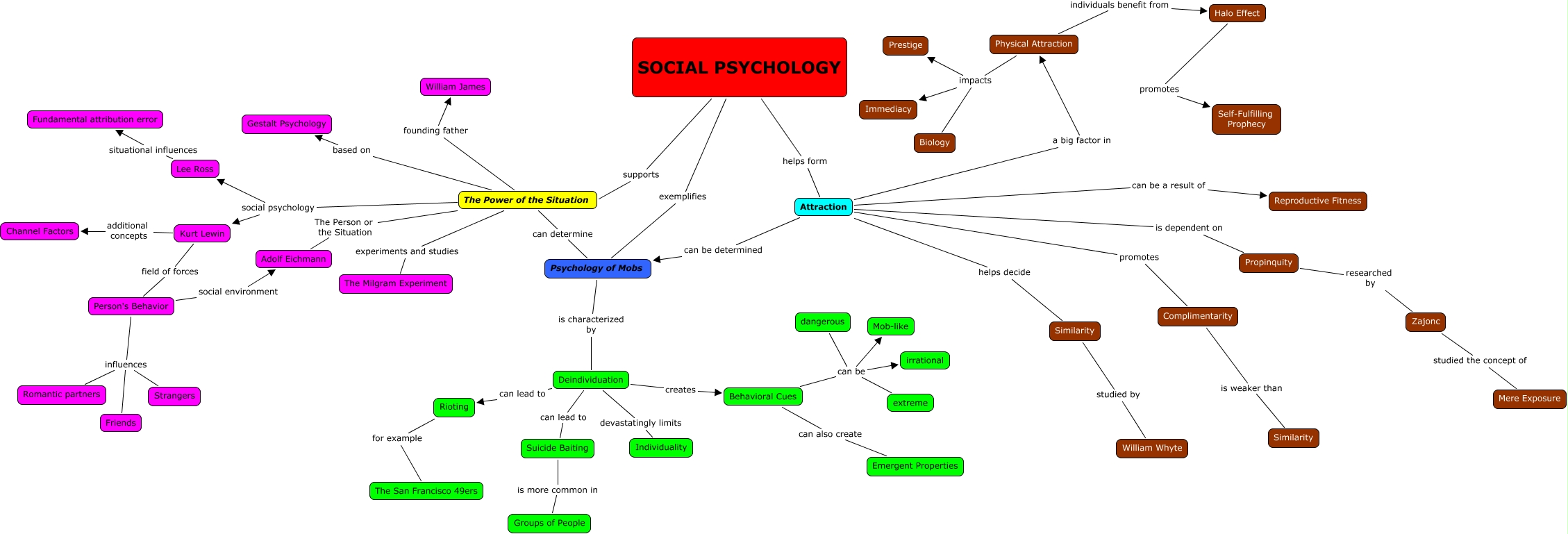 This Concept Map, created with IHMC CmapTools, has information related to: Final, Person's Behavior influences Friends, Attraction can be a result of Reproductive Fitness, Propinquity researched by Zajonc, The Power of the Situation can determine Psychology of Mobs, Zajonc studied the concept of Mere Exposure, Attraction helps decide Similarity, The Power of the Situation The Person or the Situation Adolf Eichmann, dangerous can be Mob-like, Person's Behavior influences Strangers, Lee Ross situational influences Fundamental attribution error, The Power of the Situation based on Gestalt Psychology, Attraction promotes Complimentarity, The Power of the Situation social psychology Kurt Lewin, Rioting for example The San Francisco 49ers, Deindividuation creates Behavioral Cues, Physical Attraction impacts Prestige, Psychology of Mobs is characterized by Deindividuation, SOCIAL PSYCHOLOGY supports The Power of the Situation, Behavioral Cues can be extreme, Behavioral Cues can be irrational