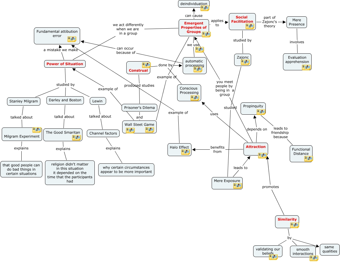 This Concept Map, created with IHMC CmapTools, has information related to: Final, automatic processing can occur because of Fundamental attibution error, Power of Situation studied by Stanley Milgram, Prisoner's Dilema and Wall Steet Game, Lewin talked about Channel factors, Halo Effect example of Fundamental attibution error, Emergent Properties of Groups we act differently when we are in a group Power of Situation, Similarity promotes Attraction, Power of Situation studied by Lewin, Mere Presence involves Evaluation apprehension, Emergent Properties of Groups example of Wall Steet Game, Power of Situation studied by Darley and Boston, Emergent Properties of Groups applies to Social Facilitation, Stanley Milgram talked about Milgram Experiment, Mere Exposure leads to Attraction, Propinquity leads to friendship because Functional Distance, Emergent Properties of Groups we use automatic processing, Attraction you meet people by being in a group Emergent Properties of Groups, Similarity by smooth interactions, Construal done by automatic processing, The Good Smaritan explains religion didn't matter in this situation it depended on the time that the participants had