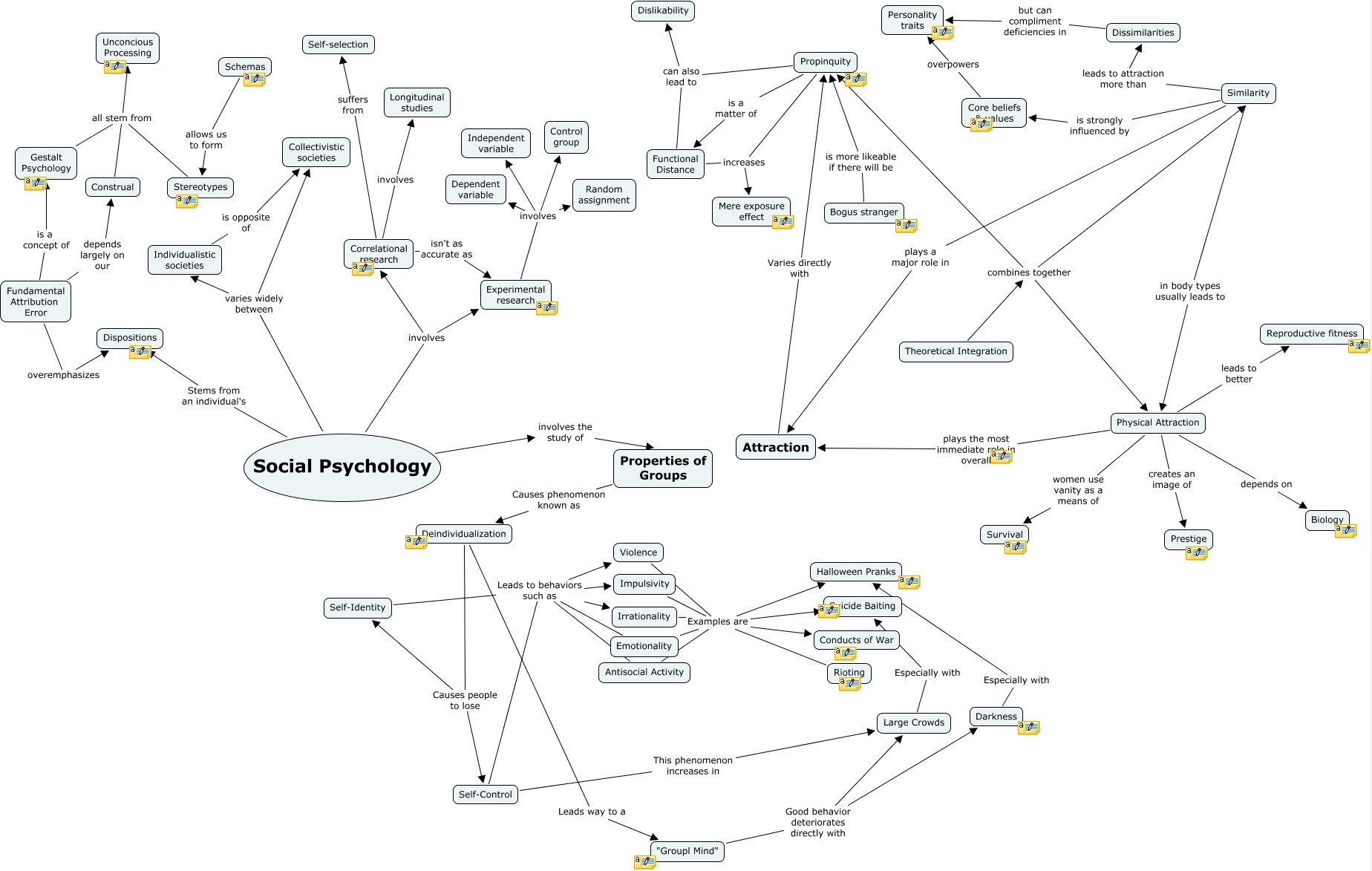 This Concept Map, created with IHMC CmapTools, has information related to: Final, Propinquity increases Mere exposure effect, Irrationality Examples are Suicide Baiting, Bogus stranger is more likeable if there will be Propinquity, Emotionality Examples are Suicide Baiting, Violence Examples are Rioting, Self-Control Leads to behaviors such as Irrationality, Impulsivity Examples are Rioting, Physical Attraction women use vanity as a means of Survival, Self-Identity Leads to behaviors such as Emotionality, Violence Examples are Conducts of War, "Groupl Mind" Good behavior deteriorates directly with Darkness, Physical Attraction leads to better Reproductive fitness, Self-Control This phenomenon increases in Large Crowds, Physical Attraction depends on Biology, Irrationality Examples are Halloween Pranks, Social Psychology Stems from an individual's Dispositions, Self-Identity Leads to behaviors such as Violence, Theoretical Integration combines together Propinquity, Similarity leads to attraction more than Dissimilarities, Fundamental Attribution Error depends largely on our Construal