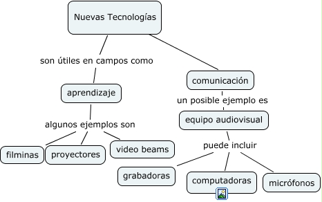 Este Cmap, tiene información relacionada con: image, aprendizaje algunos ejemplos son proyectores, equipo audiovisual puede incluir computadoras, comunicación un posible ejemplo es equipo audiovisual, equipo audiovisual puede incluir grabadoras, equipo audiovisual puede incluir micrófonos, Nuevas Tecnologías son útiles en campos como aprendizaje, aprendizaje algunos ejemplos son video beams, aprendizaje algunos ejemplos son filminas, Nuevas Tecnologías ???? comunicación