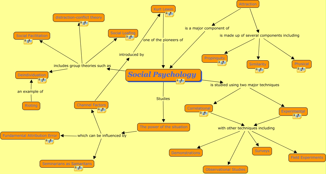 This Concept Map, created with IHMC CmapTools, has information related to: Final, Correlational with other techniques including Observational Studies, Experimental with other techniques including Demonstrations, Social Psychology is studied using two major techniques Experimental, Social Psychology includes group theories such as Social Loafing, Experimental with other techniques including Field Experiments, The power of the situation which can be influenced by Fundamental Attribution Error, Social Psychology Studies The power of the situation, Kurt Lewin one of the pioneers of Social Psychology, Social Psychology includes group theories such as Deindividuation, Attraction is a major component of Social Psychology, Correlational with other techniques including Field Experiments, Channel Factors introduced by Kurt Lewin, Social Psychology is studied using two major techniques Correlational, Correlational with other techniques including Surveys, Social Psychology includes group theories such as distraction-conflict theory, Attraction is made up of several components including Physical, Experimental with other techniques including Surveys, Correlational with other techniques including Demonstrations, The power of the situation which can be influenced by Channel Factors, Experimental with other techniques including Observational Studies