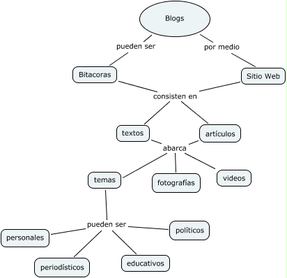 Este Cmap, tiene información relacionada con: Blogs, artículos consisten en Bitacoras, textos abarca fotografías, temas pueden ser personales, artículos consisten en Sitio Web, textos abarca videos, textos abarca temas, temas pueden ser educativos, textos abarca artículos, temas pueden ser políticos, temas pueden ser periodísticos, Blogs pueden ser Bitacoras, artículos consisten en textos, Blogs por medio Sitio Web