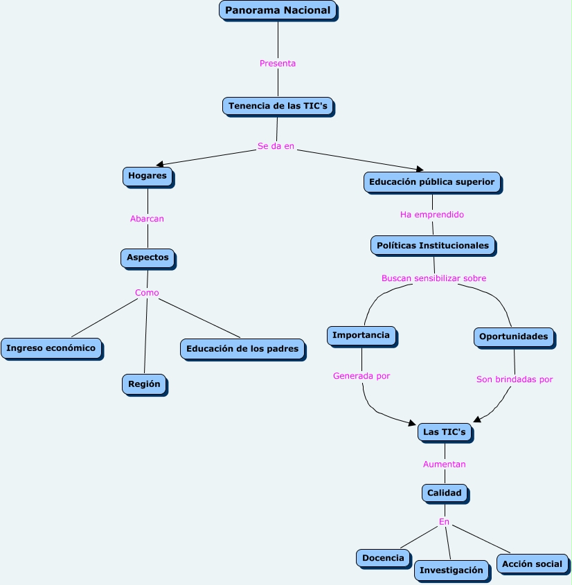 Este Cmap, tiene información relacionada con: Panorama Nacional TIC's, Oportunidades Son brindadas por Las TIC's, Políticas Institucionales Buscan sensibilizar sobre Importancia, Panorama Nacional Presenta Tenencia de las TIC's, Aspectos Como Región, Hogares Abarcan Aspectos, Las TIC's Aumentan Calidad, Calidad En Investigación, Políticas Institucionales Buscan sensibilizar sobre Oportunidades, Importancia Generada por Las TIC's, Calidad En Docencia, Aspectos Como Educación de los padres, Tenencia de las TIC's Se da en Educación pública superior, Tenencia de las TIC's Se da en Hogares, Aspectos Como Ingreso económico, Calidad En Acción social, Educación pública superior Ha emprendido Políticas Institucionales