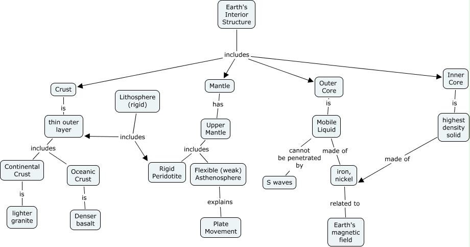 This Concept Map, created with IHMC CmapTools, has information related to: Earth's Interior Structure, Upper Mantle includes Flexible (weak) Asthenosphere, Outer Core is Mobile Liquid, Flexible (weak) Asthenosphere explains Plate Movement, Lithosphere (rigid) includes Rigid Peridotite, Inner Core is highest density solid, Earth's Interior Structure includes Inner Core, Earth's Interior Structure includes Inner Core, Earth's Interior Structure includes Crust, iron, nickel related to Earth's magnetic field, Oceanic Crust is Denser basalt, Earth's Interior Structure includes Outer Core, Earth's Interior Structure includes Outer Core, Upper Mantle includes Rigid Peridotite, Earth's Interior Structure includes Mantle, Earth's Interior Structure includes Mantle, Earth's Interior Structure includes Inner Core, Earth's Interior Structure includes Crust, highest density solid made of iron, nickel, Earth's Interior Structure includes Outer Core, Crust is thin outer layer