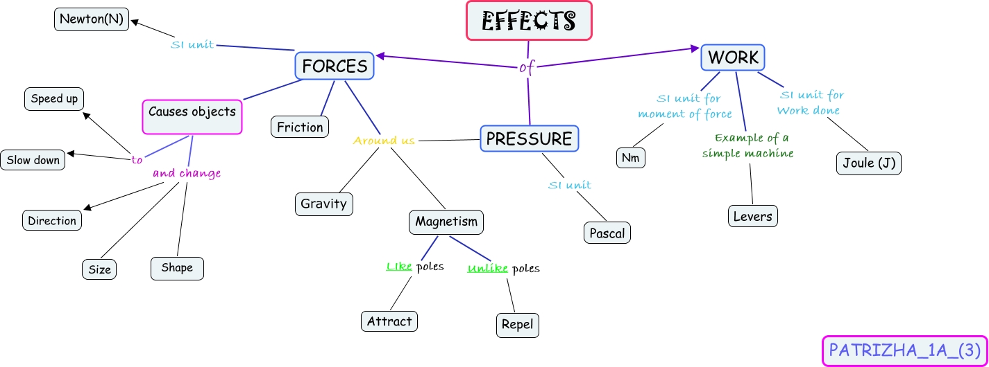 This Concept Map, created with IHMC CmapTools, has information related to: 1A_Patrizha Canlas(3)_Force,Pressure,Work_1, FORCES Around us, Causes objects and change Shape, PRESSURE SI unit Pascal, WORK Example of a simple machine Levers, Causes objects to Slow down, Causes objects to Speed up, Causes objects and change Size, PRESSURE Around us Magnetism, EFFECTS of WORK, WORK SI unit for Work done Joule (J), FORCES SI unit Newton(N), FORCES Around us Magnetism, Magnetism Unlike poles Repel, Magnetism LIke poles Attract, Causes objects and change Direction, PRESSURE Around us, FORCES ???? Causes objects, EFFECTS of PRESSURE, EFFECTS of FORCES, WORK SI unit for moment of force Nm