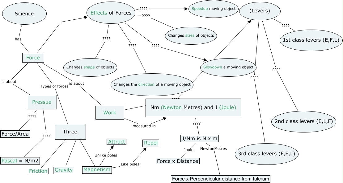 This Concept Map, created with IHMC CmapTools, has information related to: 1A_Jacob Tay(31)_Force, Pressue and Work_1, Effects of Forces ???? Slowdown a moving object, Effects of Forces ???? Speedup moving object, Work measured in Nm (Newton Metres) and J (Joule), Effects of Forces ???? Changes shape of objects, Three ???? Gravity, Force Types of forces Three, Three ???? Magnetism, Science has Force, J/Nm is N x m NewtonMetres Force x Perpendicular distance from fulcrum, J/Nm is N x m Joule Force x Distance, (Levers) ???? 2nd class levers (E,L,F), Magnetism Unlike poles Attract, Effects of Forces ???? Changes sizes of objects, Magnetism Like poles Repel, Pressue ???? Pascal = N/m2, (Levers) ???? 3rd class levers (F,E,L), Force is about Work, Force is about Pressue, Work ???? (Levers), Pressue ???? Force/Area