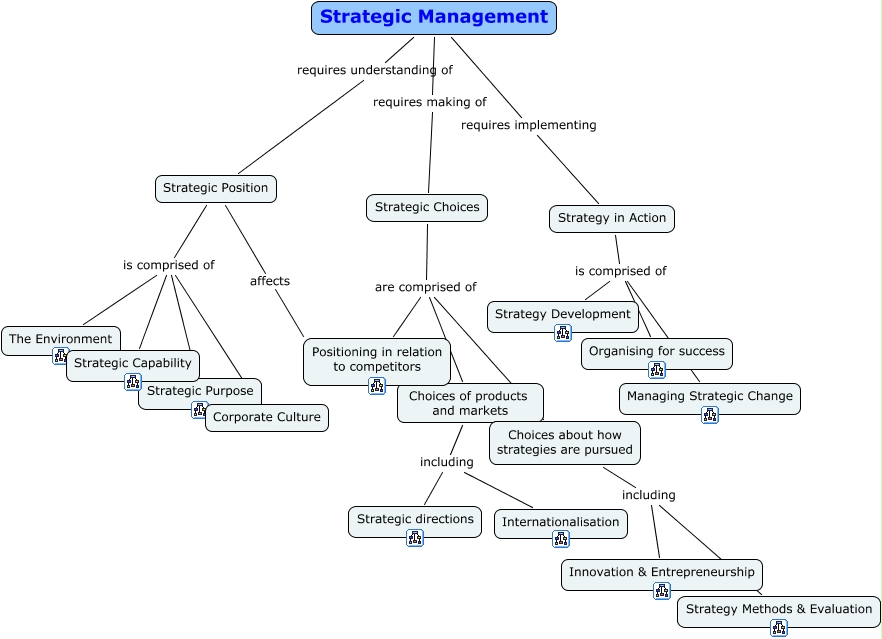 Tämä IHMC CmapToolsilla luotu käsitekartta sisältää tietoa, joka liittyy aiheeseen: Strategic Management, Strategic Choices are comprised of Positioning in relation to competitors, Strategic Management requires making of Strategic Choices, Strategic Position is comprised of The Environment, Strategic Choices are comprised of Choices of products and markets, Strategic Position is comprised of Corporate Culture, Strategic Choices are comprised of Choices about how strategies are pursued, Choices about how strategies are pursued including Strategy Methods & Evaluation, Choices of products and markets including Strategic directions, Strategic Position is comprised of Strategic Purpose, Strategic Management requires implementing Strategy in Action, Strategy in Action is comprised of Managing Strategic Change, Strategy in Action is comprised of Organising for success, Strategic Position affects Positioning in relation to competitors, Strategic Management requires understanding of Strategic Position, Choices of products and markets including Internationalisation, Choices about how strategies are pursued including Innovation & Entrepreneurship, Strategy in Action is comprised of Strategy Development, Strategic Position is comprised of Strategic Capability