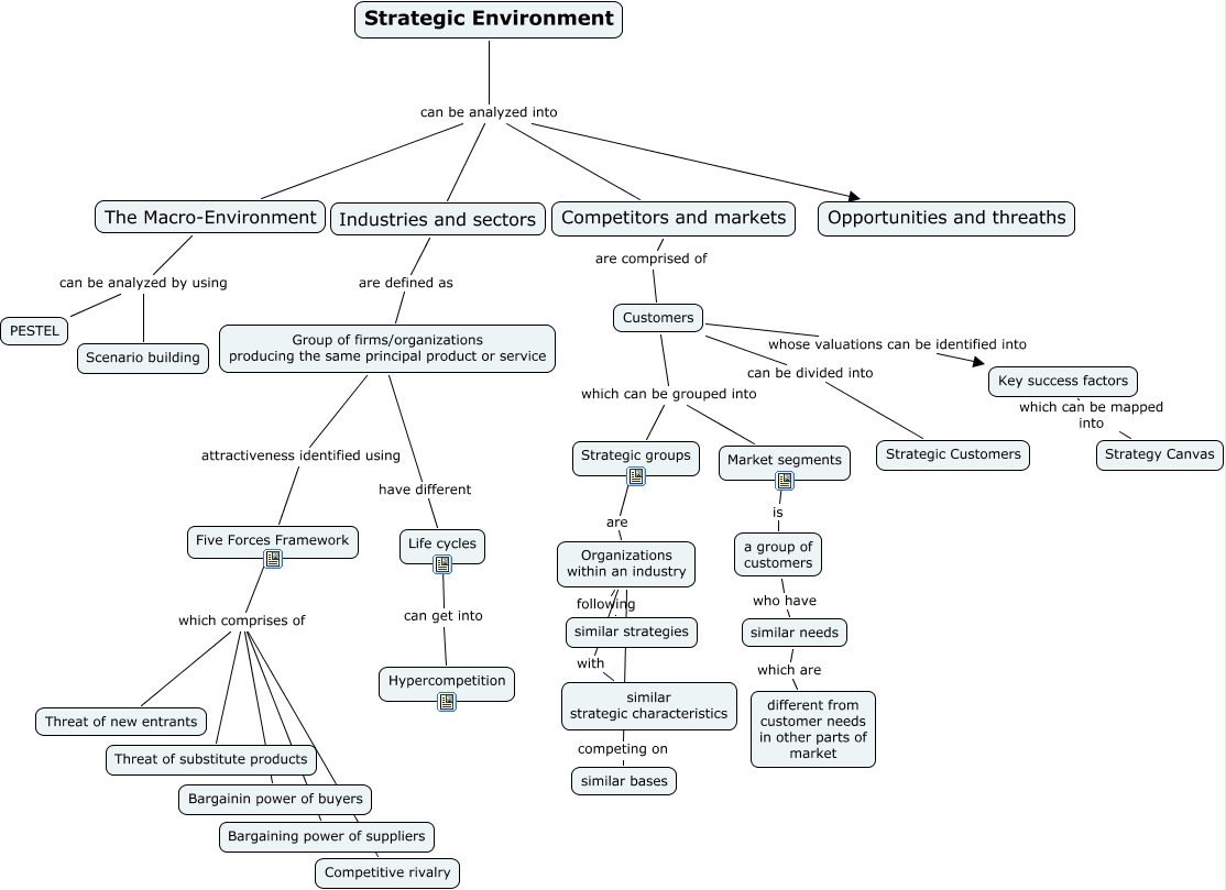 Tämä IHMC CmapToolsilla luotu käsitekartta sisältää tietoa, joka liittyy aiheeseen: Strategic Environment, Strategic Environment can be analyzed into Industries and sectors, Five Forces Framework which comprises of Competitive rivalry, Five Forces Framework which comprises of Bargainin power of buyers, Organizations within an industry with similar strategic characteristics, Five Forces Framework which comprises of Threat of new entrants, Industries and sectors are defined as Group of firms/organizations producing the same principal product or service, a group of customers who have similar needs, Strategic Environment can be analyzed into Competitors and markets, Customers whose valuations can be identified into Key success factors, Organizations within an industry following similar strategies, Market segments is a group of customers, Strategic Environment can be analyzed into The Macro-Environment, The Macro-Environment can be analyzed by using Scenario building, Strategic Environment can be analyzed into Opportunities and threaths, Five Forces Framework which comprises of Bargaining power of suppliers, Group of firms/organizations producing the same principal product or service have different Life cycles, Customers can be divided into Strategic Customers, Strategic groups are Organizations within an industry, Key success factors which can be mapped into Strategy Canvas, Organizations within an industry competing on similar bases