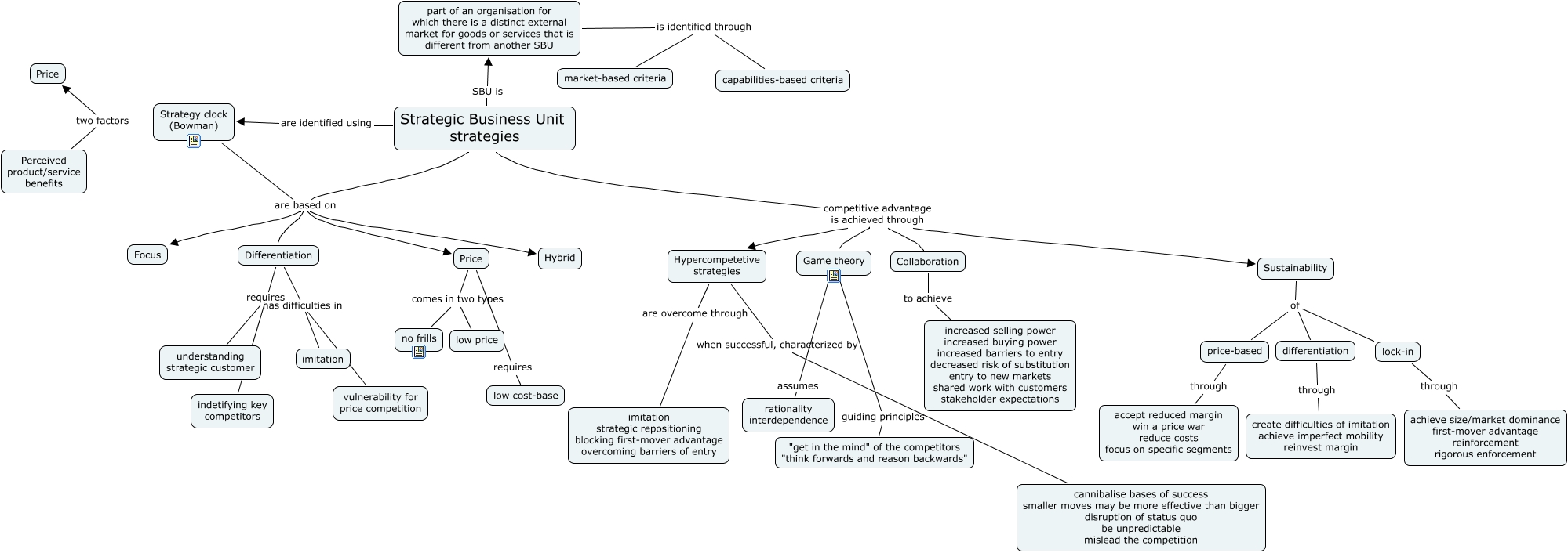 Tämä IHMC CmapToolsilla luotu käsitekartta sisältää tietoa, joka liittyy aiheeseen: SBU Strategies, Strategy clock (Bowman) are based on Differentiation, part of an organisation for which there is a distinct external market for goods or services that is different from another SBU is identified through market-based criteria, lock-in through achieve size/market dominance first-mover advantage reinforcement rigorous enforcement, Strategic Business Unit strategies competitive advantage is achieved through Sustainability, Strategy clock (Bowman) two factors Price, Strategic Business Unit strategies are identified using Strategy clock (Bowman), Strategic Business Unit strategies are based on Focus, Game theory guiding principles "get in the mind" of the competitors "think forwards and reason backwards", Sustainability of price-based, Strategic Business Unit strategies are based on Hybrid, Hypercompetetive strategies when successful, characterized by cannibalise bases of success smaller moves may be more effective than bigger disruption of status quo be unpredictable mislead the competition, Differentiation requires understanding strategic customer, Collaboration to achieve increased selling power increased buying power increased barriers to entry decreased risk of substitution entry to new markets shared work with customers stakeholder expectations, Differentiation has difficulties in vulnerability for price competition, Sustainability of lock-in, Strategic Business Unit strategies competitive advantage is achieved through Collaboration, Strategic Business Unit strategies are based on Price, Differentiation requires indetifying key competitors, Hypercompetetive strategies are overcome through imitation strategic repositioning blocking first-mover advantage overcoming barriers of entry, Game theory assumes rationality interdependence