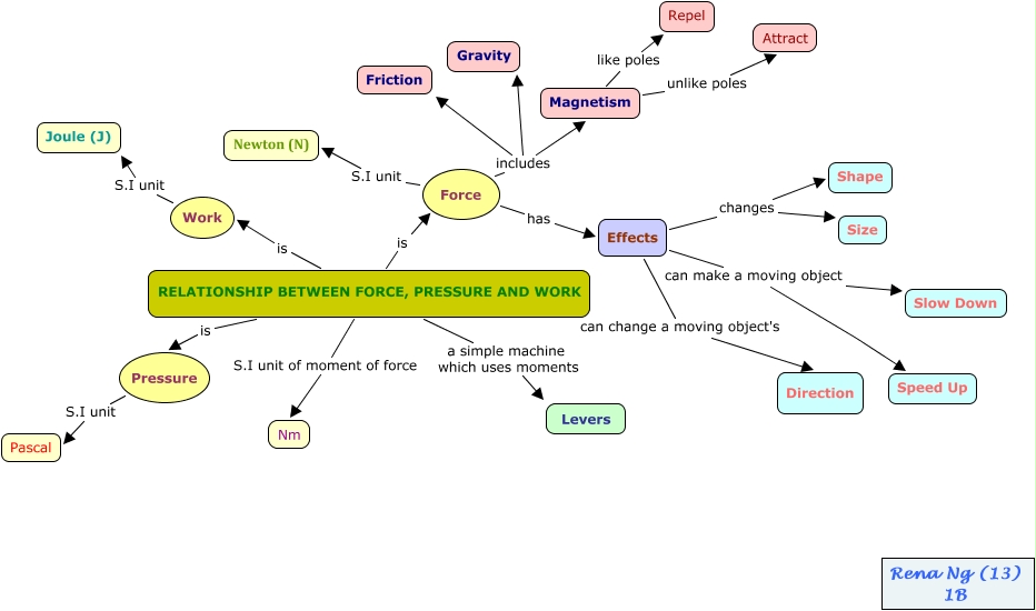 This Concept Map, created with IHMC CmapTools, has information related to: 1B_Rena Ng (13)_Force, Pressure and Work_1, Work S.I unit Joule (J), Effects can make a moving object Slow Down, Effects can make a moving object Speed Up, RELATIONSHIP BETWEEN FORCE, PRESSURE AND WORK is Force, Magnetism like poles Repel, Force includes Gravity, RELATIONSHIP BETWEEN FORCE, PRESSURE AND WORK a simple machine which uses moments Levers, Effects changes Shape, Force has Effects, Pressure S.I unit Pascal, Force includes Friction, Effects can change a moving object's Direction, RELATIONSHIP BETWEEN FORCE, PRESSURE AND WORK is Work, Force includes Magnetism, RELATIONSHIP BETWEEN FORCE, PRESSURE AND WORK S.I unit of moment of force Nm, RELATIONSHIP BETWEEN FORCE, PRESSURE AND WORK is Pressure, Magnetism unlike poles Attract, Force S.I unit Newton (N), Effects changes Size