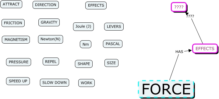 This Concept Map, created with IHMC CmapTools, has information related to: FORCE, PRESSURE, WORK - helping words, EFFECTS ???? ????, FORCE HAS EFFECTS