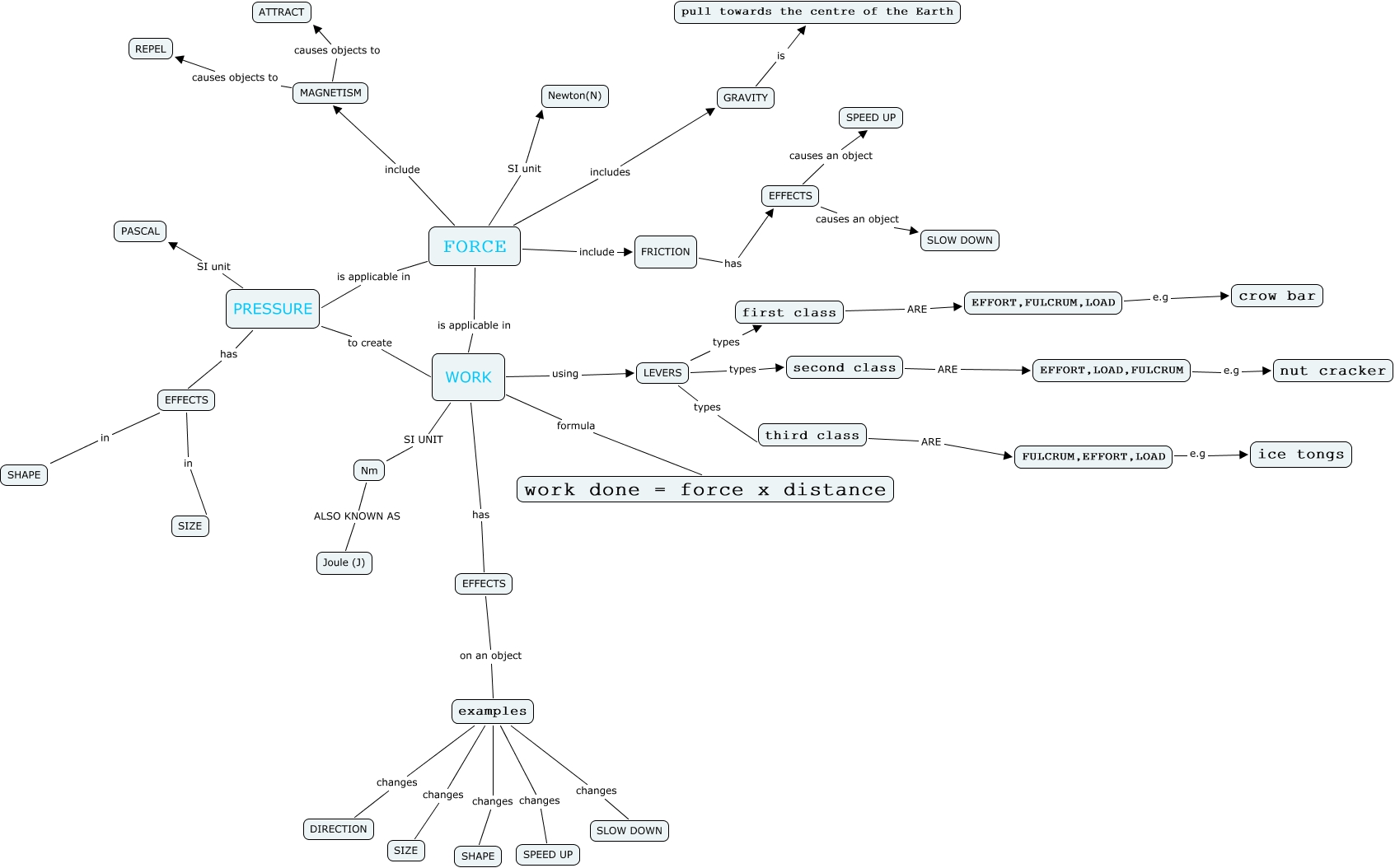 This Concept Map, created with IHMC CmapTools, has information related to: 1A_Chong jiaming (27)FORCE, PRESSURE, WORK_1, EFFORT,LOAD,FULCRUM e.g nut cracker, EFFECTS causes an object SPEED UP, FULCRUM,EFFORT,LOAD e.g ice tongs, examples changes SHAPE, FORCE is applicable in PRESSURE, FORCE includes GRAVITY, examples changes SPEED UP, second class ARE EFFORT,LOAD,FULCRUM, examples changes SLOW DOWN, MAGNETISM causes objects to REPEL, examples changes SIZE, Nm ALSO KNOWN AS Joule (J), WORK formula work done = force x distance, first class ARE EFFORT,FULCRUM,LOAD, LEVERS types first class, WORK SI UNIT Nm, EFFECTS causes an object SLOW DOWN, FORCE include FRICTION, LEVERS types second class, third class ARE FULCRUM,EFFORT,LOAD