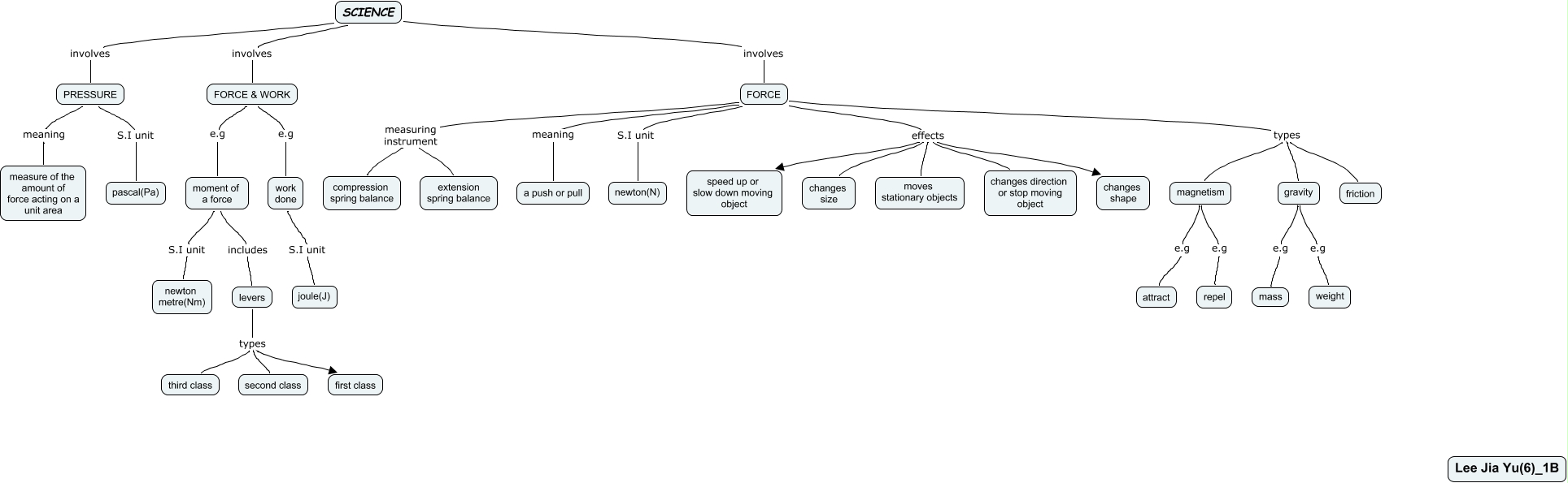 This Concept Map, created with IHMC CmapTools, has information related to: relation of pressure,force and work_lee jia yu_6_1B, FORCE meaning a push or pull, FORCE effects changes size, PRESSURE S.I unit pascal(Pa), moment of a force S.I unit newton metre(Nm), gravity e.g mass, magnetism e.g repel, PRESSURE meaning measure of the amount of force acting on a unit area, magnetism e.g attract, FORCE effects changes shape, FORCE & WORK e.g work done, moment of a force includes levers, FORCE & WORK e.g moment of a force, FORCE effects speed up or slow down moving object, FORCE types magnetism, levers types second class, FORCE effects moves stationary objects, gravity e.g weight, SCIENCE involves FORCE, levers types third class, SCIENCE involves PRESSURE