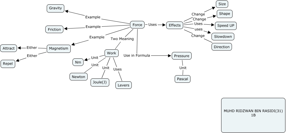 This Concept Map, created with IHMC CmapTools, has information related to: Ridzwan311b, Force Example Magnetism, Force Example Friction, Force Example Gravity, Work Unit Nm, Force Two Meaning Work, Effects Uses Speed UP, Work Uses Levers, Work Unit Joule(J), Force Use in Formula Pressure, Effects Change Size, Effects Change Shape, Effects uses Slowdown, Pressure Unit Pascal, Work Unit Newton, Magnetism Either Attract, Force Uses Effects, Effects Change Direction, Magnetism Either Repel