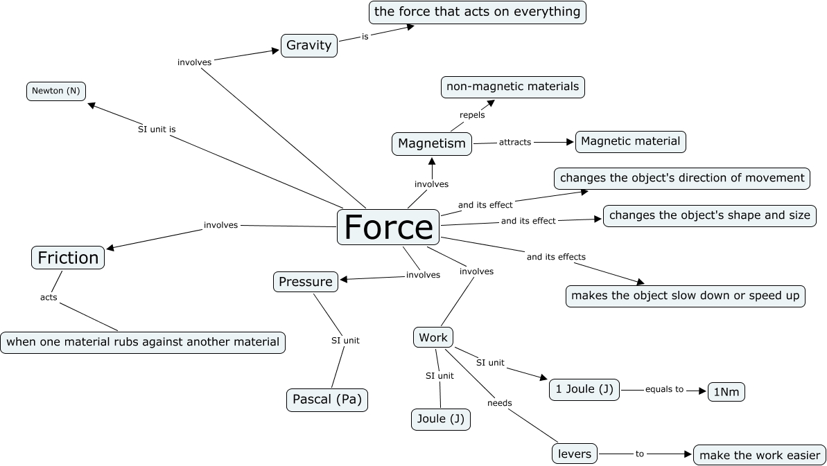 This Concept Map, created with IHMC CmapTools, has information related to: Yap Zhi Ling Lenice(18)1B-Force and Pressure, Work SI unit Joule (J), levers to make the work easier, Force and its effect changes the object's direction of movement, Force involves Magnetism, Force involves Gravity, Force and its effect changes the object's shape and size, Force involves Friction, Force SI unit is Newton (N), Force involves Work, Friction acts when one material rubs against another material, Gravity is the force that acts on everything, Force involves Pressure, Work SI unit 1 Joule (J), Magnetism attracts Magnetic material, Force and its effects makes the object slow down or speed up, Pressure SI unit Pascal (Pa), 1 Joule (J) equals to 1Nm, Magnetism repels non-magnetic materials, Work needs levers