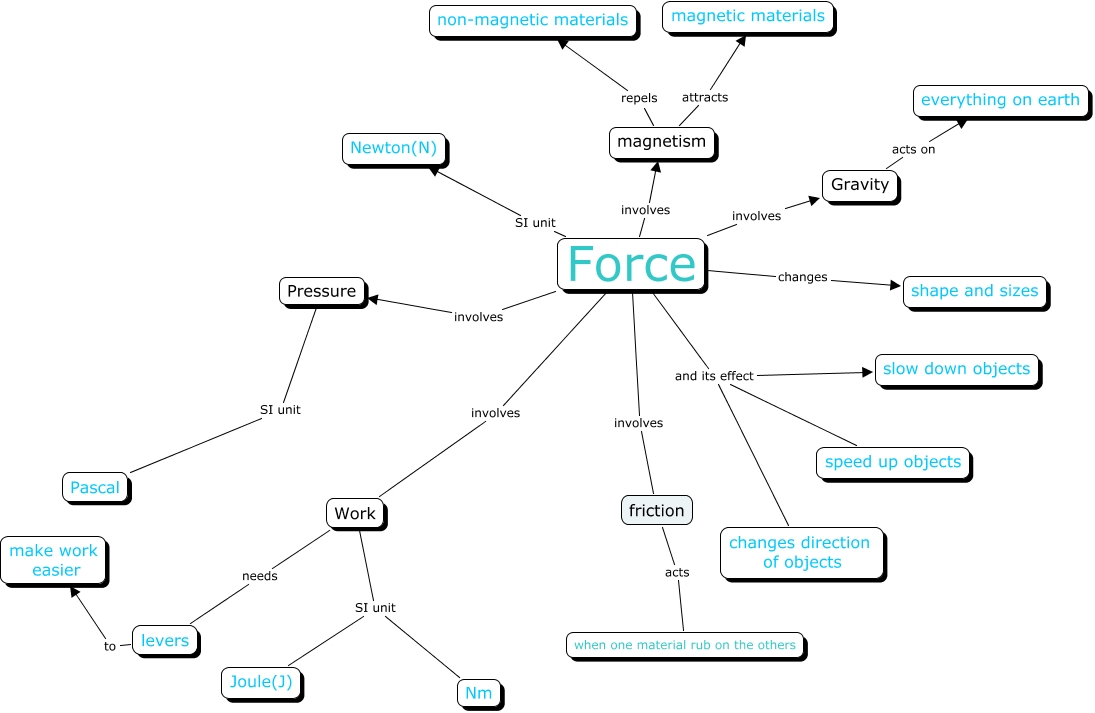 This Concept Map, created with IHMC CmapTools, has information related to: Yeo_Hui_Lin_1B_(19), Work SI unit Joule(J), levers to make work easier, Work SI unit Nm, friction acts when one material rub on the others, Force involves Work, Force and its effect changes direction of objects, Force changes shape and sizes, Work needs levers, Force SI unit Newton(N), Force and its effect speed up objects, Pressure SI unit Pascal, Force and its effect slow down objects, Force involves friction, Force involves Pressure, magnetism repels non-magnetic materials, magnetism attracts magnetic materials, Force involves magnetism, Force involves Gravity, Gravity acts on everything on earth
