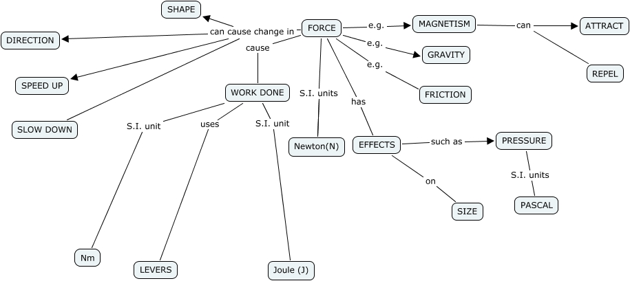 This Concept Map, created with IHMC CmapTools, has information related to: harvey_1B_23_forces,pressure,work, PRESSURE S.I. units PASCAL, FORCE S.I. units Newton(N), FORCE can cause change in SLOW DOWN, FORCE can cause change in SHAPE, MAGNETISM can ATTRACT, EFFECTS on SIZE, WORK DONE S.I. unit Nm, FORCE e.g. FRICTION, FORCE can cause change in SPEED UP, MAGNETISM can REPEL, WORK DONE uses LEVERS, EFFECTS such as PRESSURE, FORCE e.g. MAGNETISM, FORCE can cause change in DIRECTION, FORCE e.g. GRAVITY, FORCE cause WORK DONE, FORCE has EFFECTS, WORK DONE S.I. unit Joule (J)