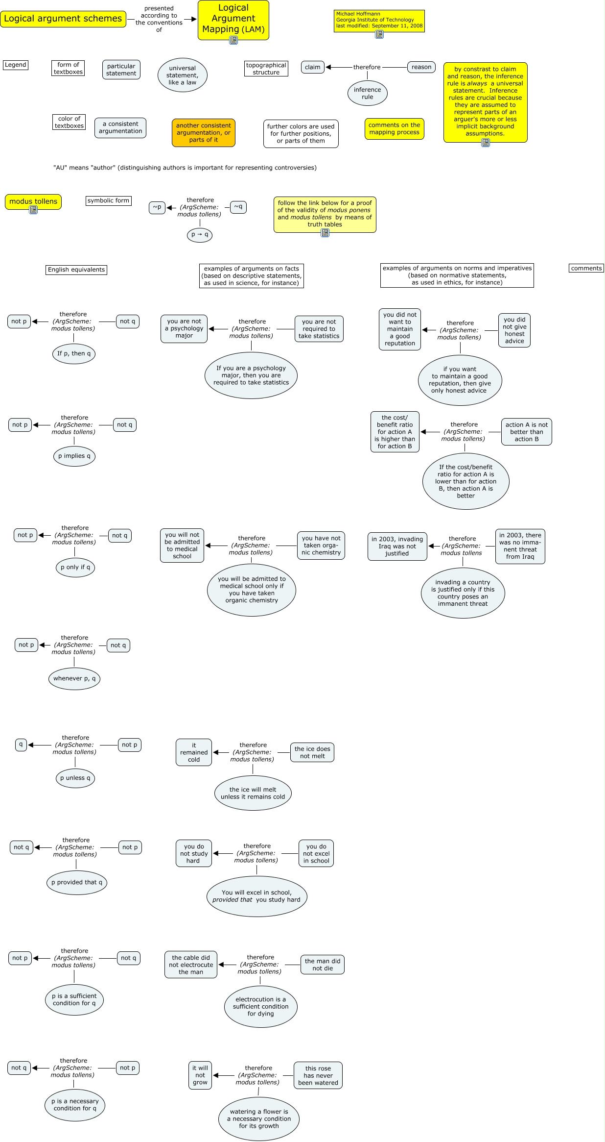 This Concept Map, created with IHMC CmapTools, has information related to: modus tollens, p implies q therefore (ArgScheme: modus tollens) not p, inference rule therefore claim, the ice will melt unless it remains cold therefore (ArgScheme: modus tollens) it remained cold, reason therefore claim, If you are a psychology major, then you are required to take statistics therefore (ArgScheme: modus tollens) you are not a psychology major, not q therefore (ArgScheme: modus tollens) not p, not p therefore (ArgScheme: modus tollens) not q, you do not excel in school therefore (ArgScheme: modus tollens) you do not study hard, electrocution is a sufficient condition for dying therefore (ArgScheme: modus tollens) the cable did not electrocute the man, If the cost/benefit ratio for action A is lower than for action B, then action A is better therefore (ArgScheme: modus tollens) the cost/ benefit ratio for action A is higher than for action B, watering a flower is a necessary condition for its growth therefore (ArgScheme: modus tollens) it will not grow, p only if q therefore (ArgScheme: modus tollens) not p, If p, then q therefore (ArgScheme: modus tollens) not p, invading a country is justified only if this country poses an immanent threat therefore (ArgScheme: modus tollens in 2003, invading Iraq was not justified, in 2003, there was no imma- nent threat from Iraq therefore (ArgScheme: modus tollens in 2003, invading Iraq was not justified, You will excel in school, provided that you study hard therefore (ArgScheme: modus tollens) you do not study hard, p unless q therefore (ArgScheme: modus tollens) q, Logical argument schemes presented according to the conventions of Logical Argument Mapping (LAM), you will be admitted to medical school only if you have taken organic chemistry therefore (ArgScheme: modus tollens) you will not be admitted to medical school, not q therefore (ArgScheme: modus tollens) not p