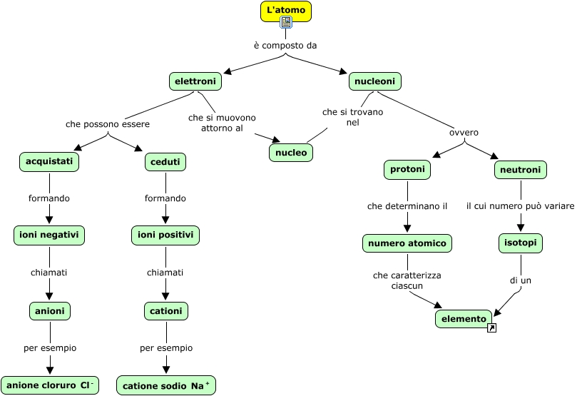 Questa Cmap, creata con IHMC CmapTools, contiene informazioni relative a: atomo, anioni per esempio <math xmlns="http://www.w3.org/1998/Math/MathML"> <mrow> <mtext> anione cloruro </mtext> <mmultiscripts> <mtext> Cl </mtext> <none/> <mtext> - </mtext> </mmultiscripts> </mrow> </math>, elettroni che possono essere acquistati, ioni negativi chiamati anioni, nucleoni ovvero protoni, isotopi di un elemento, cationi per esempio <math xmlns="http://www.w3.org/1998/Math/MathML"> <mrow> <mtext> catione sodio </mtext> <mmultiscripts> <mtext> Na </mtext> <none/> <mtext> + </mtext> </mmultiscripts> </mrow> </math>, acquistati formando ioni negativi, numero atomico che caratterizza ciascun elemento, ioni positivi chiamati cationi, neutroni il cui numero può variare isotopi, protoni che determinano il numero atomico, ceduti formando ioni positivi, nucleoni ovvero neutroni, elettroni che si muovono attorno al nucleo, L'atomo è composto da nucleoni, elettroni che possono essere ceduti, nucleoni che si trovano nel nucleo, L'atomo è composto da elettroni