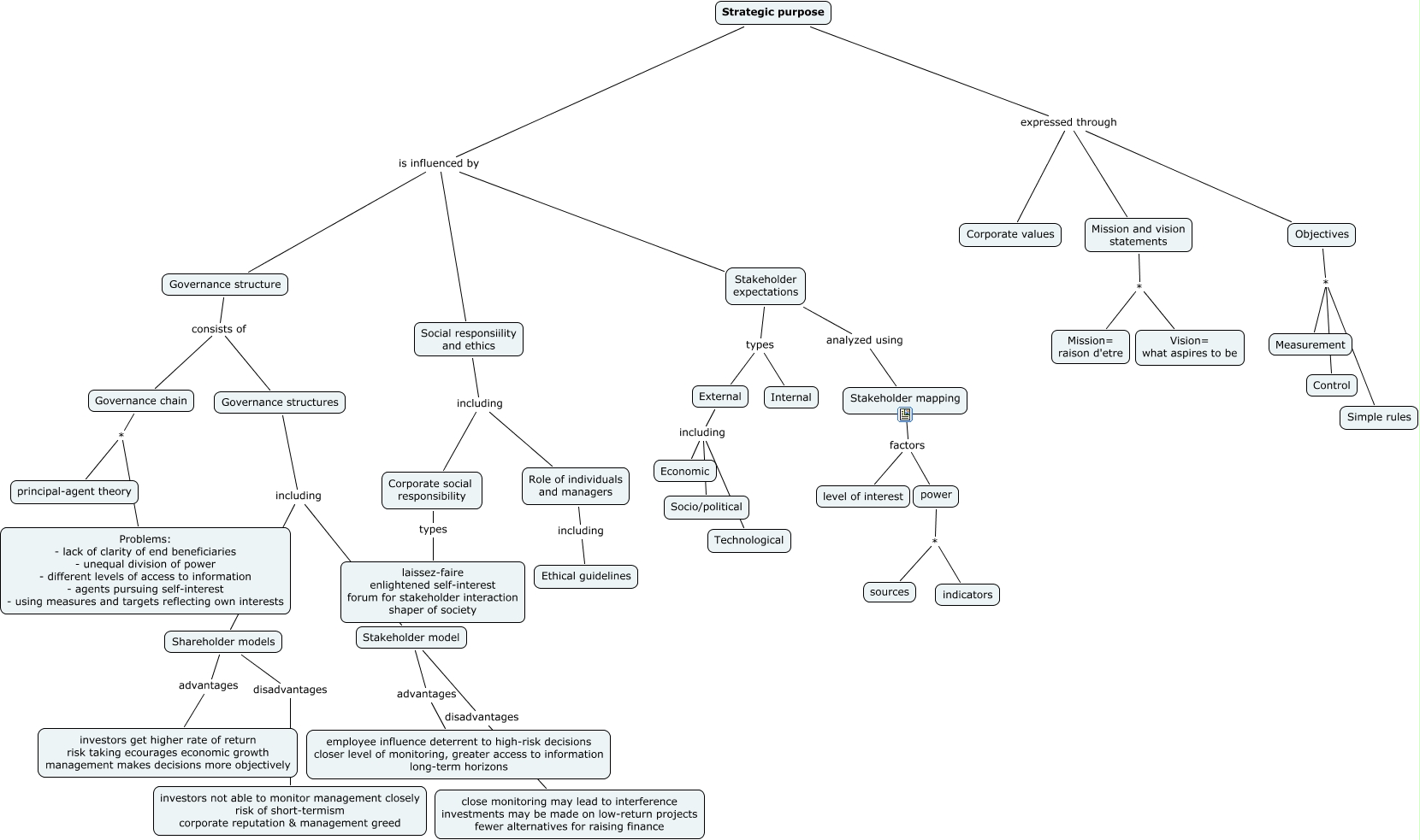 Tämä IHMC CmapToolsilla luotu käsitekartta sisältää tietoa, joka liittyy aiheeseen: Strategic purpose, Objectives * Measurement, Governance structure consists of Governance chain, Strategic purpose expressed through Objectives, Stakeholder mapping factors level of interest, Shareholder models advantages investors get higher rate of return risk taking ecourages economic growth management makes decisions more objectively, Stakeholder expectations types External, Stakeholder expectations types Internal, External including Economic, Governance chain * Problems: - lack of clarity of end beneficiaries - unequal division of power - different levels of access to information - agents pursuing self-interest - using measures and targets reflecting own interests, Role of individuals and managers including Ethical guidelines, Strategic purpose expressed through Corporate values, Governance structures including Shareholder models, Strategic purpose is influenced by Stakeholder expectations, Stakeholder model advantages employee influence deterrent to high-risk decisions closer level of monitoring, greater access to information long-term horizons, Stakeholder expectations analyzed using Stakeholder mapping, Mission and vision statements * Mission= raison d'etre, Mission and vision statements * Vision= what aspires to be, power * indicators, Strategic purpose expressed through Mission and vision statements, Corporate social responsibility types laissez-faire enlightened self-interest forum for stakeholder interaction shaper of society