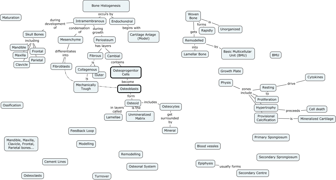 This Concept Map, created with IHMC CmapTools, has information related to: Bone Histogenesis, Osteoprogenitor Cells become Osteoblasts, Osteoid includes Osteocytes, Epiphysis usually forms Secondary Centre, Remodelled into Lamellar Bone, Physis zones include Proliferation, Periosteum has layers Cambial, Provisional Calcification is Mineralized Cartilage, Physis zones include Hypertrophy, Osteocytes get surrounded by Mineral, Periosteum has layers Fibrous, Bone Histogenesis occurs by Endochondral, Osteoid is the Unmineralized Matrix, Bone Histogenesis occurs by Intramembranous, Collagenous is Mechanically Tough, Osteoblasts form Osteoid, Fibrous is Outer, Skull Bones including Clavicle, Woven Bone gets Remodelled, Physis zones include Provisional Calcification, Mesenchyme differentiates into Fibroblasts