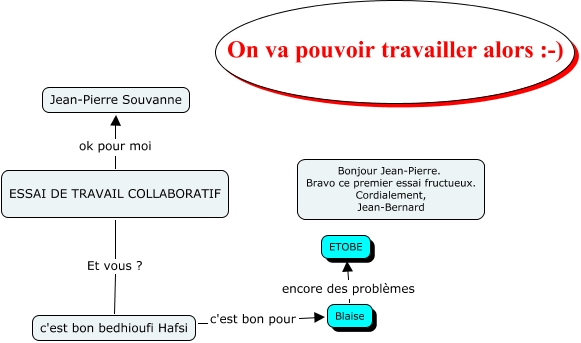 Cette carte conceptuelle, cree avec IHMC CmapTools, contient des informations liees a : Essai de travail collaboratif, c'est bon bedhioufi Hafsi c'est bon pour Blaise, ESSAI DE TRAVAIL COLLABORATIF Et vous ? c'est bon bedhioufi Hafsi, Blaise encore des problèmes ETOBE, ESSAI DE TRAVAIL COLLABORATIF ok pour moi Jean-Pierre Souvanne