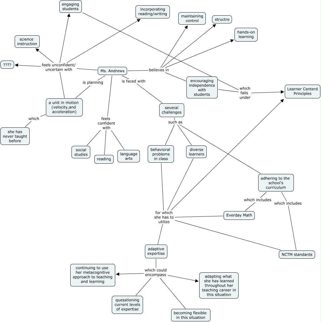 This Concept Map, created with IHMC CmapTools, has information related to: andrews 2.0, engaging students which falls under Learner Centerd Principles, Ms. Andrews believes in maintaining control, Ms. Andrews feels unconfident/ uncertain with science instruction, encouraging independence with students which falls under Learner Centerd Principles, behavioral problems in class for which she has to utilize Learner Centerd Principles, Ms. Andrews feels unconfident/ uncertain with a unit in motion (velocity,and acceleration), Ms. Andrews believes in structre, Ms. Andrews is faced with several challenges, NCTM standards for which she has to utilize adaptive expertise, adaptive expertise which could encompass adapting what she has learned throughout her teaching career in this situation, a unit in motion (velocity,and acceleration) which she has never taught before, adaptive expertise which could encompass becoming flexible in this situation, Ms. Andrews feels confident with social studies, Ms. Andrews believes in hands-on learning, adhering to the school's curriculum which includes Everday Math, Everday Math for which she has to utilize Learner Centerd Principles, Everday Math for which she has to utilize adaptive expertise, adhering to the school's curriculum which includes NCTM standards, adaptive expertise which could encompass continuing to use her metacognitive approach to teaching and learning, several challenges such as adhering to the school's curriculum