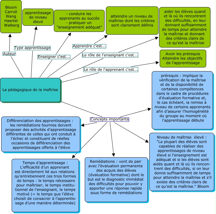 Cette carte conceptuelle, cree avec IHMC CmapTools, contient des informations liees a : carte_pedag_maitrise_berrada, La pédagogique de la maîtrise Concepts importants prérequis : implique la vérification de la maîtrise et de la disponibilité de certaines compétences dans le cadre de procédures d'évaluation formative et, le cas échéant, la remise à niveau de certains apprenants afin d’assurer l'homogénéité du groupe au moment où l'apprentissage débute, La pédagogique de la maîtrise Type apprentissage apprentissage de niveau élevé, La pédagogique de la maîtrise Auteur Bloom Carroll Wang Haertel Walberg, La pédagogique de la maîtrise Apprendre c'est... atteindre un niveau de maîtrise dont les critères sont clairement définis, La pédagogique de la maîtrise Concepts importants Différenciation des apprentissages : les remédiations fournies doivent proposer des activités d'apprentissage différentes de celles qui ont conduit à l'échec et constituent de réelles occasions de différenciation des apprentissages offerts à l'élève, La pédagogique de la maîtrise Concepts importants Remédiations : vont de pair avec l'évaluation permanente des acquis des élèves (évaluation formative) dont le but est le diagnostic immédiat des difficultés pour pouvoir y apporter une réponse rapide sous forme de remédiations, La pédagogique de la maîtrise Concepts importants Temps d’apprentissage : L’efficacité d’un apprenant est directement lié aux relations qu’entretiennent ces trois formes de temps : le temps nécessaire pour maîtriser, le temps institu- tionnel de l’enseignant, le temps motivé (= le temps que l’élève choisit de consacrer à l’apprentis- sage d’une manière déterminée), La pédagogique de la maîtrise Le rôle de l'enseignant c'est... aider les élèves quand et là où ils rencontrent des difficultés, en leur donnant suffisamment de temps pour atteindre la maîtrise et donnant des critères clairs de ce qu'est la maîtrise, La pédagogique de la maîtrise Enseigner c'est... - conduire les apprenants au succès - pratiquer un "enseignement adéquat", La pédagogique de la maîtrise Le rôle de l'apprenant c'est... Avoir les prérequis Atteindre les objectifs de l'apprentissage, La pédagogique de la maîtrise Concepts importants Niveau de maîtrise élevé : "La plupart des élèves sont capables de réaliser des apprentissages de niveau élevé si l'enseignement est adéquat et si les élèves sont aidés quant et là où ils rencon- trent des difficultés, si on leur donne suffisamment de temps pour atteindre la maîtrise et s'il existe des critères clairs de ce qu'est la maîtrise." Bloom