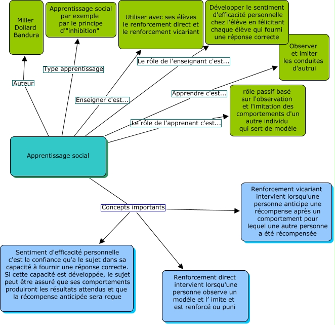 Cette carte conceptuelle, cree avec IHMC CmapTools, contient des informations liees a : carte_apprentissage_social_berrada, Apprentissage social Le rôle de l'enseignant c'est... Développer le sentiment d'efficacité personnelle chez l'élève en félicitant chaque élève qui fourni une réponse correcte, Apprentissage social Enseigner c'est... Utiliser avec ses élèves le renforcement direct et le renforcement vicariant, Apprentissage social Apprendre c'est... Observer et imiter les conduites d'autrui, Apprentissage social Type apprentissage Apprentissage social par exemple par le principe d'"inhibition", Apprentissage social Auteur Miller Dollard Bandura, Apprentissage social Le rôle de l'apprenant c'est... rôle passif basé sur l'observation et l'imitation des comportements d'un autre individu qui sert de modèle, Apprentissage social Concepts importants Sentiment d'efficacité personnelle c'est la confiance qu'a le sujet dans sa capacité à fournir une réponse correcte. Si cette capacité est développée, le sujet peut être assuré que ses comportements produiront les résultats attendus et que la récompense anticipée sera reçue, Apprentissage social Concepts importants Renforcement vicariant intervient lorsqu'une personne anticipe une récompense après un comportement pour lequel une autre personne a été récompensée, Apprentissage social Concepts importants Renforcement direct intervient lorsqu'une personne observe un modèle et l’ imite et est renforcé ou puni