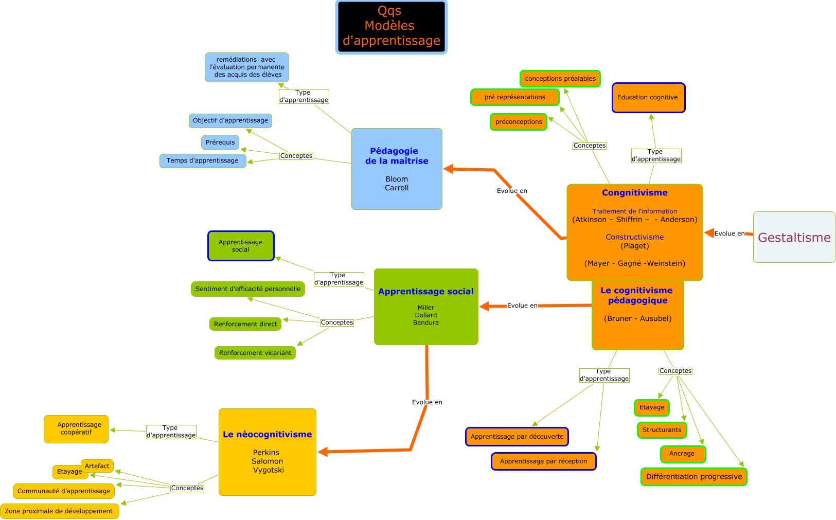 Cette carte conceptuelle, cree avec IHMC CmapTools, contient des informations liees a : cc intermediare Aboutajdyne, Le cognitivisme pédagogique (Bruner - Ausubel) Conceptes Etayage, Le néocognitivisme Perkins Salomon Vygotski Conceptes Zone proximale de développement, Congnitivisme Traitement de l'information (Atkinson – Shiffrin – - Anderson) Constructivisme (Piaget) (Mayer - Gagné -Weinstein) Type d'apprentissage Education cognitive, Apprentissage social Miller Dollard Bandura Evolue en Le néocognitivisme Perkins Salomon Vygotski, Apprentissage social Miller Dollard Bandura Conceptes Sentiment d'efficacité personnelle, Pédagogie de la maîtrise Bloom Carroll Conceptes Temps d'apprentissage, Congnitivisme Traitement de l'information (Atkinson – Shiffrin – - Anderson) Constructivisme (Piaget) (Mayer - Gagné -Weinstein) Evolue en Pédagogie de la maîtrise Bloom Carroll, Pédagogie de la maîtrise Bloom Carroll Conceptes Objectif d'apprentissage, Le cognitivisme pédagogique (Bruner - Ausubel) Conceptes Ancrage, Pédagogie de la maîtrise Bloom Carroll Conceptes Prérequis, Le cognitivisme pédagogique (Bruner - Ausubel) Conceptes Structurants, Le cognitivisme pédagogique (Bruner - Ausubel) Conceptes Différentiation progressive, Le cognitivisme pédagogique (Bruner - Ausubel) Type d'apprentissage Apprentissage par découverte, Gestaltisme Evolue en Congnitivisme Traitement de l'information (Atkinson – Shiffrin – - Anderson) Constructivisme (Piaget) (Mayer - Gagné -Weinstein), Apprentissage social Miller Dollard Bandura Type d'apprentissage Apprentissage social, Apprentissage social Miller Dollard Bandura Conceptes Renforcement direct, Congnitivisme Traitement de l'information (Atkinson – Shiffrin – - Anderson) Constructivisme (Piaget) (Mayer - Gagné -Weinstein) Conceptes conceptions préalables, Le néocognitivisme Perkins Salomon Vygotski Conceptes Communauté d’apprentissage, Le cognitivisme pédagogique (Bruner - Ausubel) Evolue en Apprentissage social Miller Dollard Bandura, Pédagogie de la maîtrise Bloom Carroll Type d'apprentissage remédiations avec l'évaluation permanente des acquis des élèves