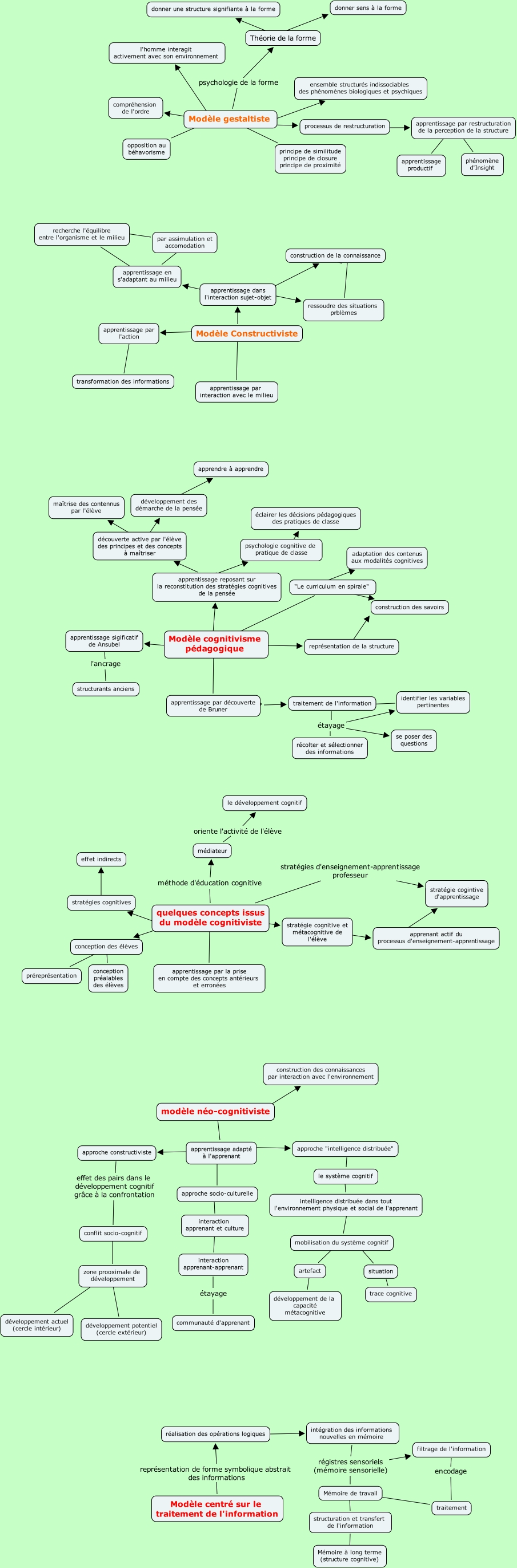 Cette carte conceptuelle, cree avec IHMC CmapTools, contient des informations liees a : modele_apprentissage_enseignement, quelques concepts issus du modèle cognitiviste ???? stratégie cognitive et métacognitive de l'élève, Modèle gestaltiste ???? l'homme interagit activement avec son environnement, artefact ???? développement de la capacité métacognitive, quelques concepts issus du modèle cognitiviste méthode d'éducation cognitive médiateur, Modèle gestaltiste ???? ensemble structurés indissociables des phénomènes biologiques et psychiques, Modèle gestaltiste ???? compréhension de l'ordre, structuration et transfert de l'information ???? Mémoire à long terme (structure cognitive), approche "intelligence distribuée" ???? le système cognitif, Théorie de la forme ???? donner sens à la forme, apprentissage adapté à l'apprenant ???? approche socio-culturelle, processus de restructuration ???? apprentissage par restructuration de la perception de la structure, quelques concepts issus du modèle cognitiviste ???? apprentissage par la prise en compte des concepts antérieurs et erronées, mobilisation du système cognitif ???? situation, apprentissage par restructuration de la perception de la structure ???? phénomène d'Insight, par assimulation et accomodation ???? recherche l'équilibre entre l'organisme et le milieu, stratégie cognitive et métacognitive de l'élève ???? apprenant actif du processus d'enseignement-apprentissage, apprentissage reposant sur la reconstitution des stratégies cognitives de la pensée ???? psychologie cognitive de pratique de classe, psychologie cognitive de pratique de classe ???? éclairer les décisions pédagogiques des pratiques de classe, Modèle gestaltiste psychologie de la forme Théorie de la forme, apprentissage dans l'interaction sujet-objet ???? ressoudre des situations prblèmes