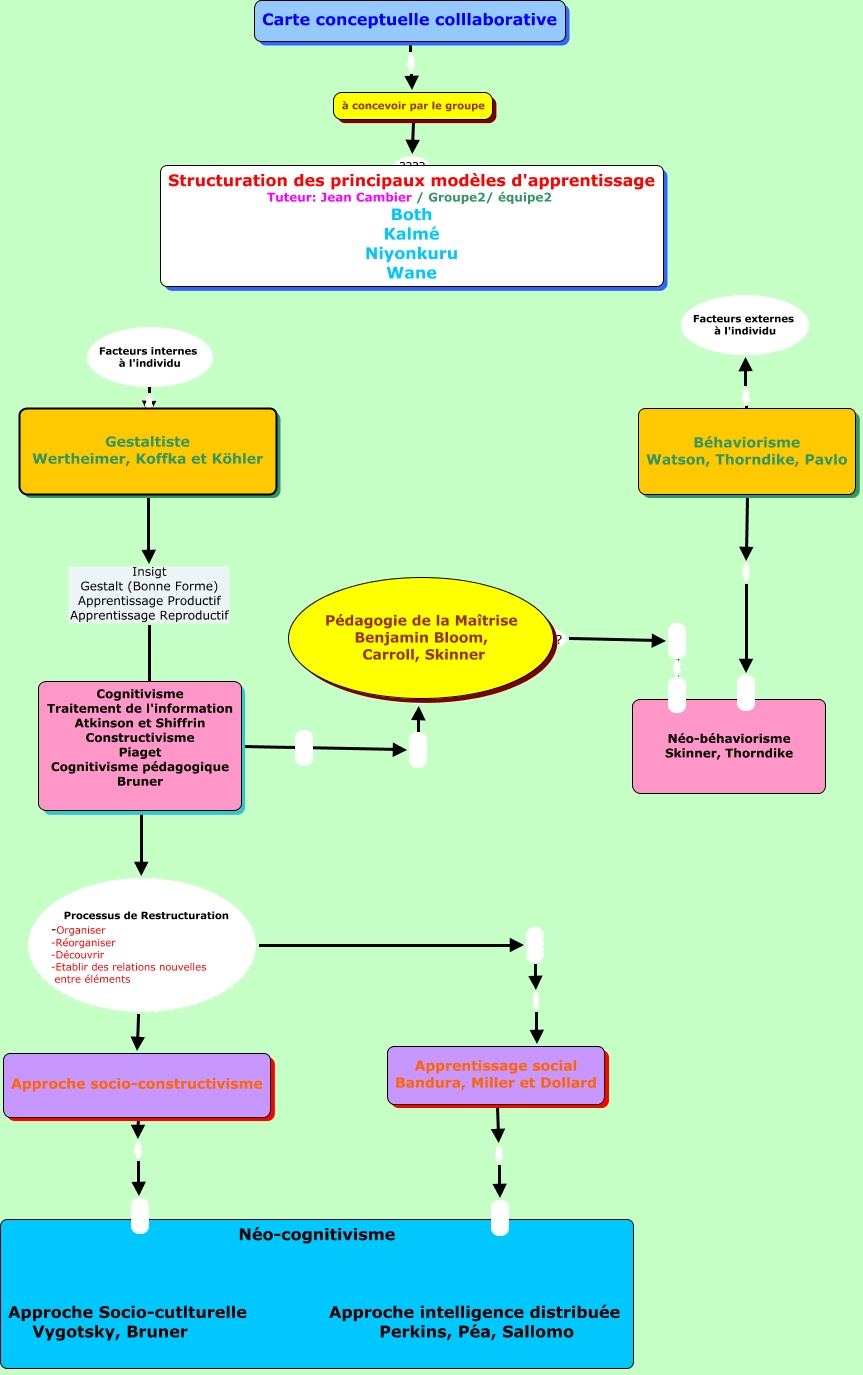 Cette carte conceptuelle, cree avec IHMC CmapTools, contient des informations liees a : carte-collective-équip2 à améliorer, Gestaltiste Wertheimer, Koffka et Köhler Facteurs internes à l'individu, Béhaviorisme Watson, Thorndike, Pavlo Facteurs externes à l'individu, Approche socio-constructivisme, Pédagogie de la Maîtrise Benjamin Bloom, Carroll, Skinner ????, Apprentissage social Bandura, Miller et Dollard, Cognitivisme Traitement de l'information Atkinson et Shiffrin Constructivisme Piaget Cognitivisme pédagogique Bruner ????,, Cognitivisme Traitement de l'information Atkinson et Shiffrin Constructivisme Piaget Cognitivisme pédagogique Bruner Processus de Restructuration -Organiser -Réorganiser -Découvrir -Etablir des relations nouvelles entre éléments, Cognitivisme Traitement de l'information Atkinson et Shiffrin Constructivisme Piaget Cognitivisme pédagogique Bruner Processus de Restructuration -Organiser -Réorganiser -Découvrir -Etablir des relations nouvelles entre éléments Approche socio-constructivisme, Gestaltiste Wertheimer, Koffka et Köhler Insigt Gestalt (Bonne Forme) Apprentissage Productif Apprentissage Reproductif ????,, Béhaviorisme Watson, Thorndike, Pavlo