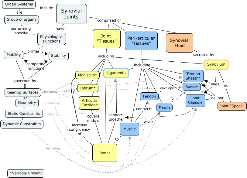 This Concept Map, created with IHMC CmapTools, has information related to: Joint Organ System, Articular Cartilage covers ends of Bones, Synovial Joints comprised of Joint "Tissues", Bearing Surfaces including Labrum*, Joint "Tissues" including Ligaments, Group of organs performing specific Physiological Functions, Stability governed by Dynamic Constraints, Geometry including Meniscus*, Synovium lines Tendon Sheath*, Organ Systems include Synovial Joints, Mobility governed by Dynamic Constraints, Peri-articular "Tissues" including Bursa*, Stability governed by Geometry, Synovial Joints comprised of Synovial Fluid, Mobility governed by Geometry, Labrum* increase congruency of Bones, Joint "Tissues" including Articular Cartilage, Joint "Tissues" including Synovium, Meniscus* increase congruency of Bones, Bearing Surfaces including Articular Cartilage, Synovium lines Bursa*