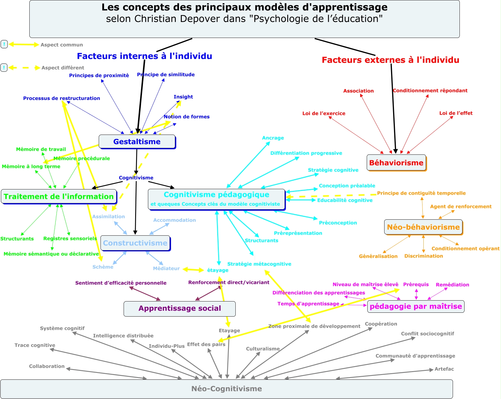 Cette carte de concepts créée avec IHMC CmapTools traite de: Proposition pour la CC collective, Les concepts des principaux modèles d'apprentissage selon Christian Depover dans "Psychologie de l’éducation" Facteurs externes à l'individu Béhaviorisme, Les concepts des principaux modèles d'apprentissage selon Christian Depover dans "Psychologie de l’éducation" Facteurs internes à l'individu Gestaltisme, Traitement de l'information Mémoire à long terme Notion de formes, Gestaltisme Insight Assimilation, Néo-Cognitivisme Zone proximale de développement Stratégie métacognitive, Gestaltisme Cognitivisme Constructivisme, Néo-Cognitivisme Etayage étayage, Gestaltisme Cognitivisme Cognitivisme pédagogique et queques Concepts clés du modèle cognitiviste, Gestaltisme Processus de restructuration Assimilation, Constructivisme Médiateur étayage, Néo-Cognitivisme Effet des pairs Prérequis, Néo-béhaviorisme Principe de contiguïté temporelle Cognitivisme pédagogique et queques Concepts clés du modèle cognitiviste, Gestaltisme Processus de restructuration Schème, Gestaltisme Cognitivisme Traitement de l'information