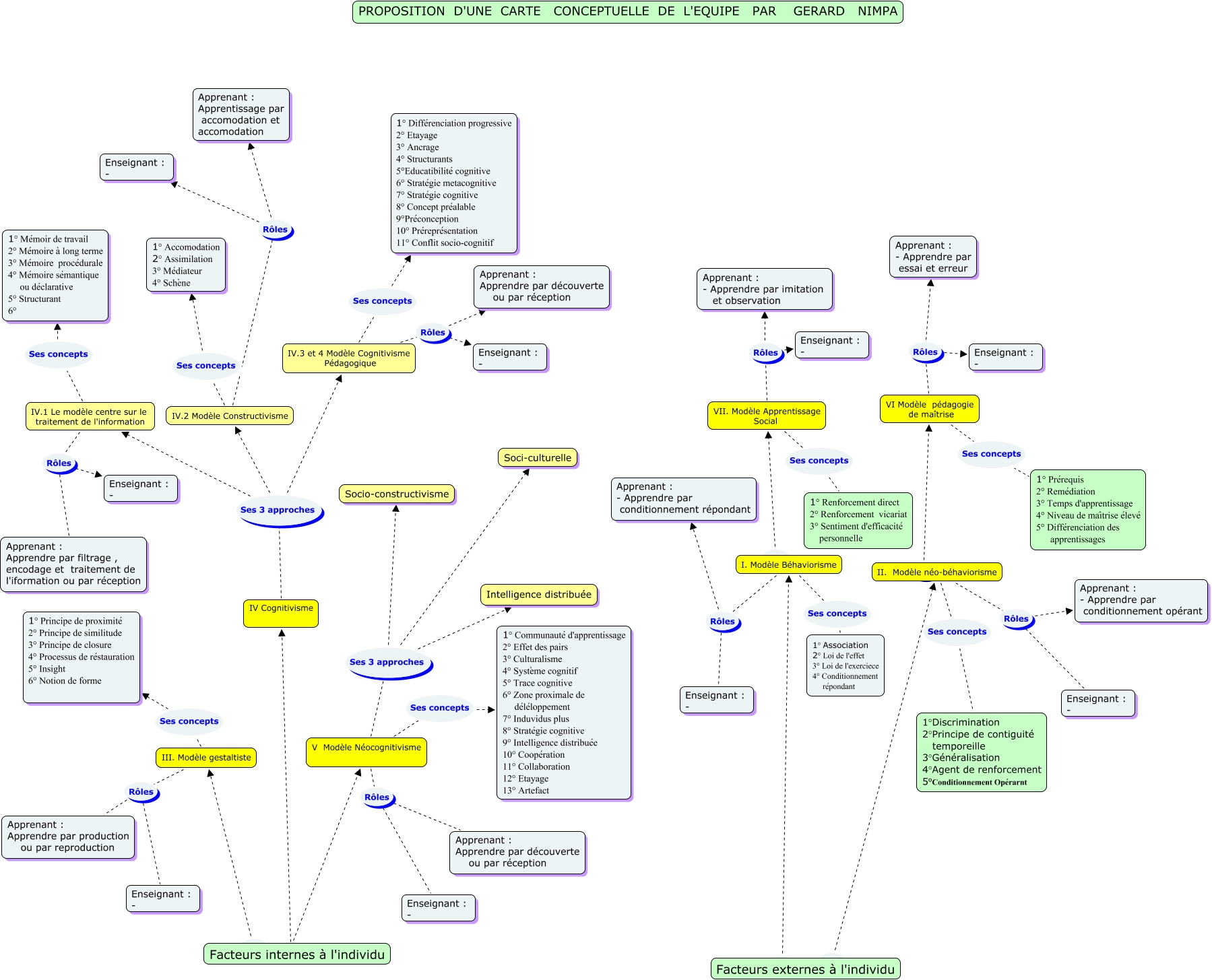 Cette carte conceptuelle, cree avec IHMC CmapTools, contient des informations liees a : Carte conceptuelle éq 2_NIMPA, IV.3 et 4 Modèle Cognitivisme Pédagogique Rôles Apprenant : Apprendre par découverte ou par réception, I. Modèle Béhaviorisme Rôles Apprenant : - Apprendre par conditionnement répondant, Facteurs internes à l'individu ???? III. Modèle gestaltiste, IV.1 Le modèle centre sur le traitement de l'information Ses concepts 1° Mémoir de travail 2° Mémoire à long terme 3° Mémoire procédurale 4° Mémoire sémantique ou déclarative 5° Structurant 6°, Facteurs externes à l'individu ???? I. Modèle Béhaviorisme, III. Modèle gestaltiste Rôles Apprenant : Apprendre par production ou par reproduction, Facteurs internes à l'individu ???? V Modèle Néocognitivisme, IV.1 Le modèle centre sur le traitement de l'information Rôles Apprenant : Apprendre par filtrage , encodage et traitement de l'iformation ou par réception, Facteurs externes à l'individu ???? II. Modèle néo-béhaviorisme, IV Cognitivisme Ses 3 approches IV.3 et 4 Modèle Cognitivisme Pédagogique, IV.2 Modèle Constructivisme Ses concepts 1° Accomodation 2° Assimilation 3° Médiateur 4° Schène, VI Modèle pédagogie de maîtrise Rôles Apprenant : - Apprendre par essai et erreur, V Modèle Néocognitivisme Ses 3 approches Intelligence distribuée, I. Modèle Béhaviorisme Rôles Enseignant : -, IV.1 Le modèle centre sur le traitement de l'information Rôles Enseignant : -, IV.3 et 4 Modèle Cognitivisme Pédagogique Rôles Enseignant : -, IV.3 et 4 Modèle Cognitivisme Pédagogique Ses concepts 1° Différenciation progressive 2° Etayage 3° Ancrage 4° Structurants 5°Educatibilité cognitive 6° Stratégie metacognitive 7° Stratégie cognitive 8° Concept préalable 9°Préconception 10° Préreprésentation 11° Conflit socio-cognitif, V Modèle Néocognitivisme Ses 3 approches Socio-constructivisme, I. Modèle Béhaviorisme Ses concepts 1° Association 2° Loi de l'effet 3° Loi de l'exerciece 4° Conditionnement répondant, VII. Modèle Apprentissage Social Ses concepts 1° Renforcement direct 2° Renforcement vicariat 3° Sentiment d'efficacité personnelle